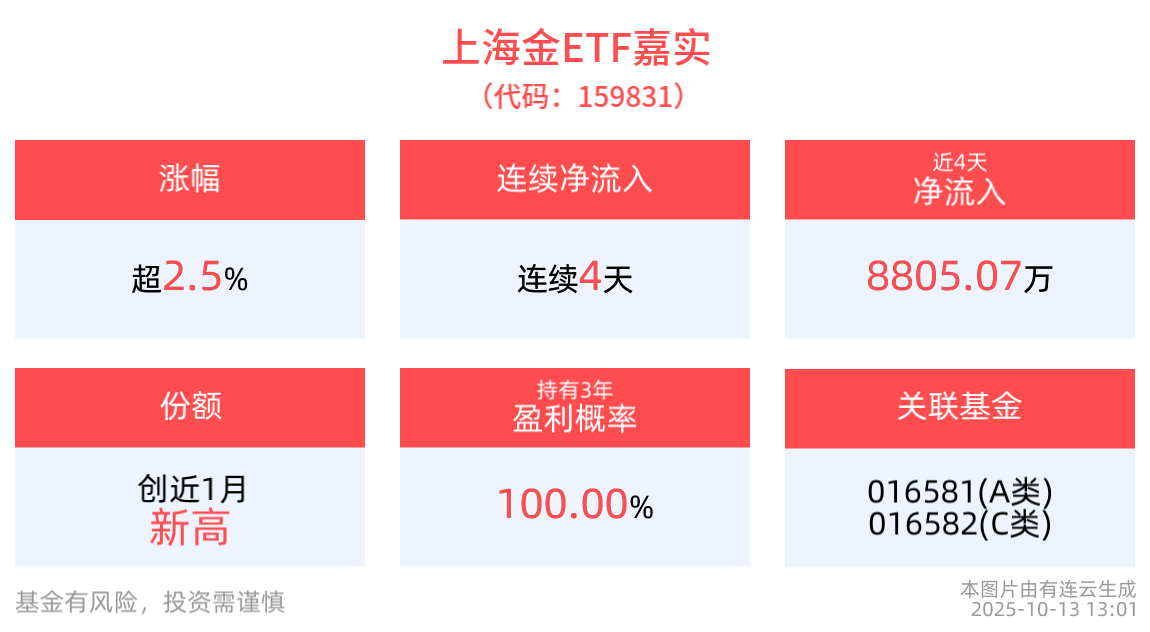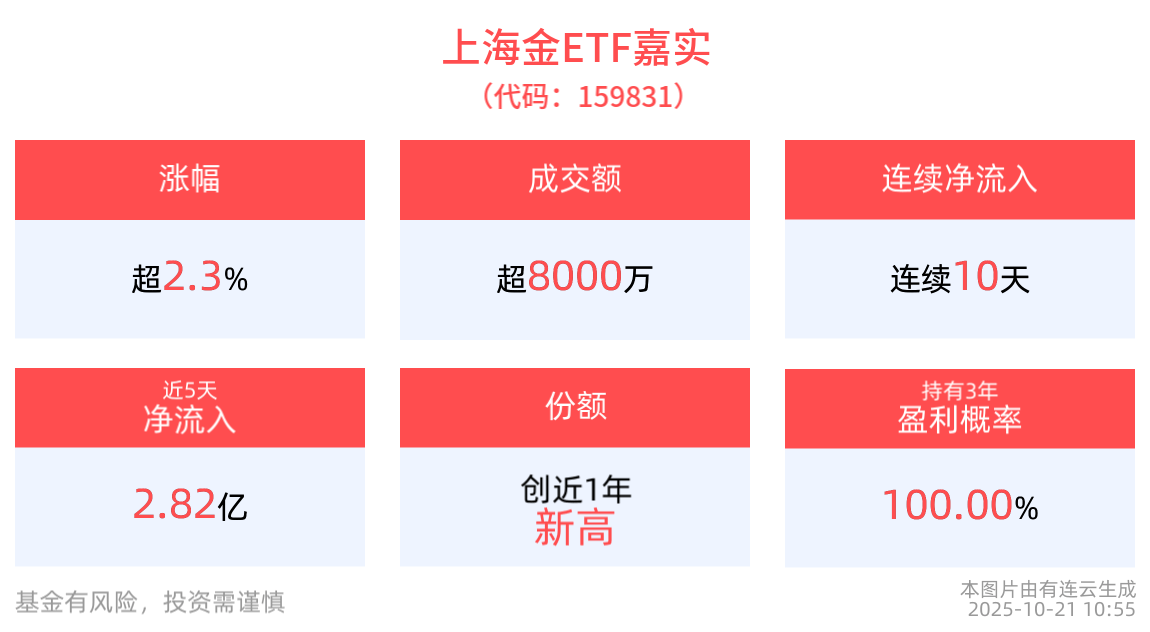 全球投资者扫货黄金ETF,上海金ETF嘉实(159831)红盘上扬,近10日累计“吸金”近4800万元