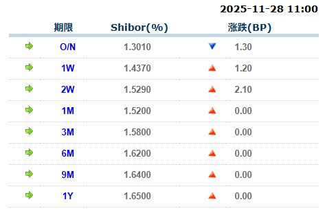 新华财经北京11月28日电(刘润榕)人民银行28日开展3013亿元7天期逆回购操作,鉴于当日有3750亿元7天期逆回购到期,公开市场实现净回笼737亿 元。本周人民银行合计开展15118亿元7天期逆回购操作和10000亿元1年期中期借贷便利(MLF)操作,因本周有16760亿元7天期逆回购和9000亿元1年期 中期借贷便利(MLF)到期,公开市场合计实现净回笼642亿元。 上海银行间同业拆放利率(Shibor)延续窄幅震荡。具体来看,隔夜Shibor下跌1.30BP,报1.3010%;7天Shibor上涨1.20BP,报1.4370%;14天Shibor上涨 210BP,报1.5290%。 | | | | 2025-11-28 11:00 | | --- | --- | --- | --- | | | 期限 | Shibor(%) | 涨跌(BP) | | 中 | O/N | 1.3010 | 1.30 | | 中 | 1W | 1.4370 | 1.20 | | 中 | 2W | 1.5290 | 2.10 | | ⇒ | 1M | 1.5200 | 0.00 | | t | 3M | 1.5800 | 0 ...