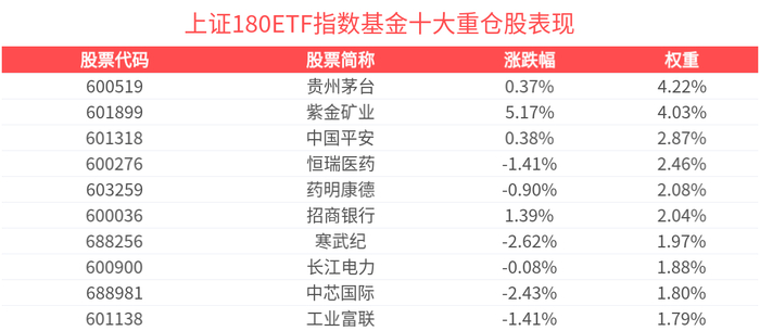 上证180指数及ETF表现 - 截至2026年1月20日15:00,上证180指数上涨0.08% [1] - 指数成分股中,中国化学上涨10.01%,中国电建上涨7.02%,恒力石化上涨6.62%,海螺水泥上涨5.74%,华鲁恒升上涨4.54% [1] - 上证180ETF指数基金上涨0.16%,实现4连涨,最新价报1.26元 [1] 上证180ETF基金特征 - 该基金紧密跟踪上证180指数,该指数选取沪市市值规模较大、流动性较好的180只证券,反映上海证券市场核心上市公司整体表现 [2] - 基金场内代码为530280,并设有场外联接基金(平安上证180ETF联接A:023547;平安上证180ETF联接C:023548;平安上证180ETF联接E:024609) [3] 指数权重构成 - 截至2025年12月31日,上证180指数前十大权重股合计占比25.29% [2] - 前十大权重股包括贵州茅台(权重4.21%)、紫金矿业(权重3.78%)、恒瑞医药(权重3.05%)、药明康德(权重2.69%)、中国平安(权重2.31%)、寒武纪(权重2.28%)、中芯国际(权重2.23%)、工业富联(权重2.11%)、招商银行(权重1.95%)、长江电力 [2] - 截至新闻发布时,前十大权重股中,贵州茅台下跌0.18%,紫金矿业上涨0.13%,恒瑞医药下跌1.01%,药明康德下跌2.86%,中国平安上涨0.45%,寒武纪下跌5.40%,中芯国际下跌2.48%,工业富联下跌2.02%,招商银行上涨0.47%,海光信息下跌0.68% [3] 基金流动性 - 截至2026年1月20日,上证180ETF指数基金盘中换手率为0.11%,成交额为6.58万元 [1] - 近1年该基金日均成交额为256.26万元 [1] 基金风险收益指标 - 截至2026年1月16日,上证180ETF指数基金成立以来夏普比率为2.13 [1] - 截至2026年1月20日,该基金今年以来最大回撤为1.30%,相对基准回撤为0.06% [1] 基金费用与跟踪精度 - 上证180ETF指数基金的管理费率为0.15%,托管费率为0.05% [1] - 截至2026年1月20日,该基金近3个月跟踪误差为0.022% [1]
