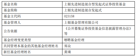 基金人事变动 - 上银基金管理有限公司增聘黄璜为上银先进制造混合发起式证券投资基金的基金经理 [1][2] - 新任基金经理黄璜历任上银基金高级研究员、基金经理助理等职务 [1] - 该基金目前由郑众与黄璜共同管理 [2] 基金产品表现 - 上银先进制造混合发起式A/C类份额成立于2025年1月23日 [1] - 截至2025年11月3日,该基金A类份额成立以来收益率为6.86%,C类份额收益率为6.52% [1]
