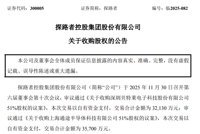 在尝到跨界的"甜头"后,A股老牌户外用品企业探路者(300005)(证券代码:300005)拟再度加码芯片业务。 12月1日晚间,探路者公告称,拟合计以6.78亿元分别收购两家芯片公司51%股权。具体来看,探路者拟以3.21亿元收购深圳贝特莱电子科技股份有限公司 (以下简称贝特莱)51%股权,以3.57亿元收购上海通途半导体科技有限公司(以下简称上海通途)51%股权。 根据公告,探路者对上述两家芯片公司的估值均采用了收益法。其中,贝特莱的增值率达363.26%,上海通途的增值率达2119.65%。 拟收购两家芯片公司控制权 探路者此次抛出的两项收购,均计划使用公司自有资金支付,不构成关联交易和重大资产重组,经公司董事会审议批准后即可实施。 从公告披露的内容来看,贝特莱和上海通途均在细分行业内拥有一定影响力,且在2025年前8个月均已实现盈利。 其中,贝特莱是一家专注数模混合信号链芯片及解决方案设计的国家高新技术企业,主要产品为指纹识别芯片、触控芯片及专用MCU芯片。经过多年发 展,已成长为细分领域中领先的芯片设计及解决方案供应商。 财务数据显示,贝特莱2025年1—8月实现营业收入1.66亿元,净利润为177 ...