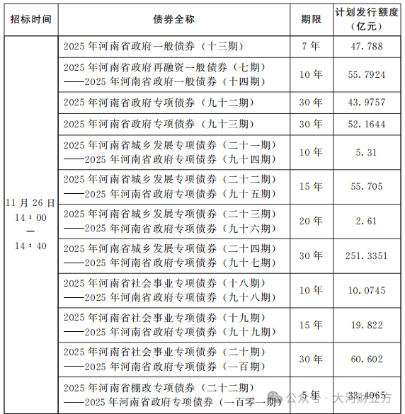 发行概况 - 河南省财政厅计划于11月26日发行总额737.5865亿元的2025年地方政府债券 [1] - 债券品种为记账式固定利率附息债券,包含新增一般债券、新增专项债券及再融资债券 [1] - 本次发行债券期限覆盖5年、7年、10年、15年、20年和30年等多种期限 [1] 债券类型与额度分布 - 7年期新增一般债券计划发行47.788亿元 [1] - 新增专项债券总额为577.3702亿元,其中30年期额度最大,为408.0772亿元,15年期次之,为75.527亿元 [1] - 再融资债券总额为112.4283亿元,包括10年期一般债券55.7924亿元,以及20年期和30年期专项债券 [1] 募集资金用途 - 新增一般债券资金用于河南省基础设施项目建设 [2] - 新增专项债券(九十四至一百零三期)资金主要用于城乡发展、社会事业、棚户区改造等领域 [3] - 再融资一般债券和部分再融资专项债券用于偿还存量债务,另有一部分再融资专项债券用于置换存量隐性债务 [3] 商丘市具体项目分析 - 商丘市共获得45个项目的地方政府债券资金支持,覆盖市本级及下辖各区县 [5][6] - 城乡发展类项目数量最多,涉及金额巨大,例如商丘市提升城市公共供水普及率项目(9400万元)、睢县鞋业生态城项目(5000万元)及多个标准化厂房建设项目 [5][6] - 社会事业类项目重点在医疗领域,如商丘市眼科医院旧楼改造(2600万元)、商丘市儿童医院医疗智能化系统建设(10000万元)以及多个区县的医院能力提升项目 [5][6] - 棚户区改造项目分布广泛,例如商丘市城乡一体化示范区和悦新城棚改工程(700万元)、永城市多个安置社区建设项目(总计11900万元) [5][6]