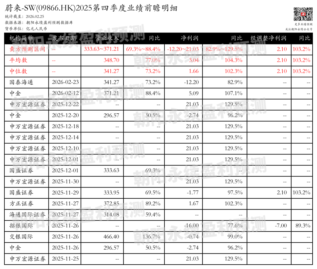 蔚来-SW第四季度业绩预期 - 根据朝阳永续截至2026年02月25日的数据,卖方对蔚来第四季度的营业收入预测区间为333.63亿元至371.21亿元,同比增长69.3%至88.4% [1][7] - 卖方对第四季度净利润的预测区间为-12.20亿元至21.03亿元,同比增长82.9%至129.5% [1][7] - 卖方预测第四季度经调整净利润为2.10亿元,同比变动103.2% [1][7] - 卖方预测的平均值为:营业收入348.70亿元(同比增长77.0%),净利润3.04亿元(同比增长104.3%),经调整净利润2.10亿元(同比增长103.2%) [2][8] - 卖方预测的中位数为:营业收入341.27亿元(同比增长73.2%),净利润1.66亿元(同比增长102.3%),经调整净利润2.10亿元(同比增长103.2%) [2][8] - 各机构具体预测存在差异,例如国泰海通预测营收341.27亿元(增73.2%),净利润-12.20亿元(增82.9%)[2][8];中金预测营收371.21亿元(增88.4%),净利润5.09亿元(增107.1%)[2][8];申万宏源证券多次预测净利润为21.03亿元(增129.5%)[2][8] 最新卖方核心观点与公司近况 - 国盛证券指出,公司第三季度交付量同比增长40.8%,收入同比增长16.7%,整体毛利率同比提升3.2个百分点至13.9% [3][9] - 公司预计第四季度交付量同比增长65.1%-72.0%,收入同比增长66.3%-72.8%,车辆毛利率预计约18%,并预计实现季度扭亏为盈 [3][9] - 公司2026年上半年目标突破月销5万辆汽车,全年目标实现扭亏为盈 [3][9] - 海通国际证券指出,公司第三季度营收为217.9亿元,同比增长17%,汽车销售收入192.0亿元,同比增长15% [4][12] - 第三季度汽车交付量达8.7万辆,同比增长41%,创季度新高,毛利率提升至13.9%,汽车毛利率为14.7% [4][12] - 公司Non-GAAP经调整净亏损在第三季度同比和环比均有所收窄 [4][12] 业务进展与未来规划 - 乐道L90上市三个月交付超3.3万台,连续3个月领跑大型纯电SUV市场;全新ES8上市41天内交付破万 [3][10] - 2026年计划推出3款新车型,包括豪华旗舰车蔚来ES9、大五座SUV乐道L80、大五座的蔚来ES7 [3][11] - 公司发布世界模型NWM,将为搭载NX9031及NVIDIA Orin X芯片的车型分批推送升级,提升智能驾驶与安全性能 [4][11] - 公司自研的神玑NX9031芯片计划通过合资公司向其他车企或非汽车行业客户推广,探索外供可能性 [4][12] - 乐道品牌计划覆盖10–30万元价格带,以扩大市场覆盖面 [5][12] - 出海方面,公司与当地经销商合作,萤火虫车型成为重点出口车型,构建从入门到高端的出海路径 [5][12] - 国盛证券预计公司2025-2027年销量约33万、52万、63万辆,总收入达862亿元、1412亿元、1654亿元,亏损率逐步收窄并扭亏为盈 [3][9]