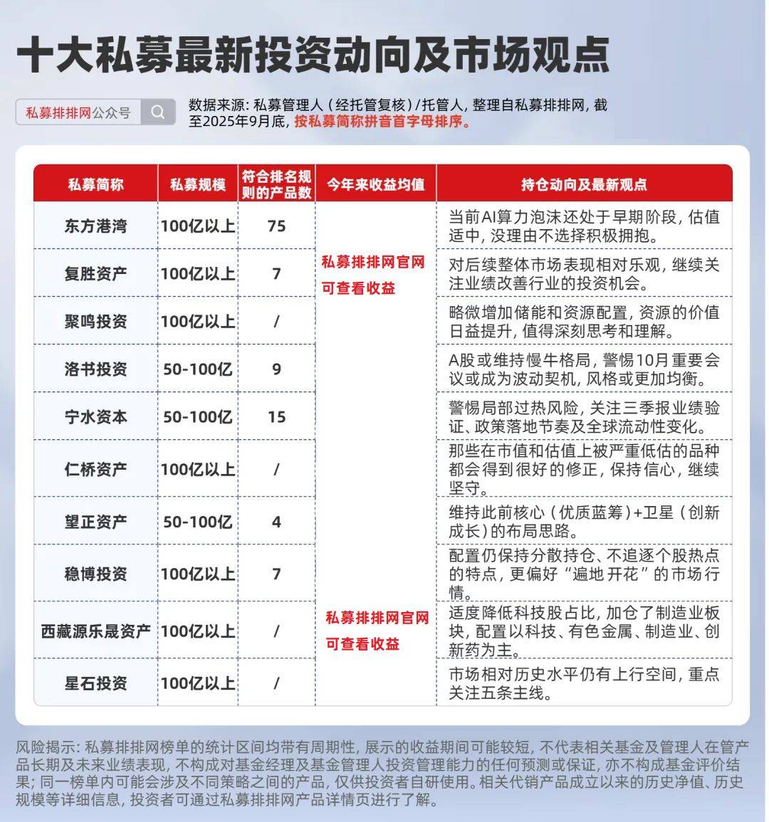 市场环境与私募业绩表现 - 9月份A股市场波动加大,呈现震荡行情,主要受市场获利盘累积、美国政府停摆、关税冲击及三季报业绩期来临等因素影响 [2] - 多家百亿规模私募在9月份取得亮眼业绩,例如复胜资产旗下有业绩显示的产品共7只,9月份收益均值高达***% [5],东方港湾旗下75只产品9月份收益均值高达***% [7],稳博投资旗下8只产品9月份收益均值高达***% [10],洛书投资旗下9只产品9月份收益均值高达***% [12],望正资产旗下4只产品9月份收益均值高达***% [16] 私募机构投资策略与市场观点 复胜资产 - 对后续整体市场表现相对乐观,坚持业绩驱动的核心投资理念,关注行业层面龙头公司的盈利趋势 [5] - 观察到工程机械、化工等“反内卷”行业龙头公司已出现业绩边际改善迹象,将继续关注业绩改善行业的投资机会 [5] 东方港湾 - 坚定看好AI产业链,认为当前AI算力泡沫还处于早期阶段,估值适中,没理由不选择积极拥抱 [3][7] - 认为繁荣的终点必定是泡沫,股价波动是常态,投资不能因噎废食,在充分理解风险的同时要有选择性地承担 [7] 稳博投资 - 当前策略配置保持分散持仓、不追逐个股热点的特点,更偏好“遍地开花”的市场行情 [2][8] - 策略呈现一定的“行业动量”效应,小幅超配了“电子”等相关科技板块 [8] - 对10月市场持乐观态度,认为市场有望从“一枝独秀”转向“多点开花”,进一步挖掘“AI+”延伸方向 [9] 洛书投资 - 认为A股或维持慢牛格局,但短期以流动性驱动为主,警惕10月重要会议或成为波动契机,风格或更加均衡 [4][12] - 港股补涨进程或暂未结束,大宗商品总体大概率维持震荡,债市逐渐与股市解耦 [12] - 海外关注美国政府停摆何时结束,在此之前美股美债或延续震荡,黄金维持坚挺 [12] 宁水资本 - 认为三季度行情的核心驱动力来自政策、流动性与产业趋势的三重支撑,但需警惕局部过热风险 [14] - 指出市场潜藏风险包括估值分化加剧带来短期波动压力、经济基本面修复仍显疲弱、内外部不确定性犹存 [14] - 四季度需关注三季报业绩验证、政策落地节奏及全球流动性变化,适度平衡高景气科技与低估值周期板块的配置比例 [4][14] 望正资产 - 对于组合的构建,维持核心(优质蓝筹)+卫星(创新成长)的布局思路 [4][16] - 核心部分坚持以企业经营质量为纲,自下而上持有明显低估的优质公司,主要分布在互联网、电子、汽车等行业 [16] - 卫星部分关注高景气、持续兑现业绩的创新成长方向,包括AI算力、AI应用、智能驾驶等 [16] 聚鸣投资 - 9月份总体配置变化不大,略增加了储能和资源的配置 [4][18] - 认为较早布局的储能板块迎来爆发,国内外需求共振逐渐得到市场共识,盈利和增长的确定性逐渐提高 [18] - 指出资源板块基本面强劲,金价站上3800美元/盎司,铜价超过1万美元/吨,全球矿产国已认识到矿产资源的不可再生价值及其抗通胀属性,资源价值日益提升的趋势值得深刻思考 [18] 仁桥资产 - 认为当前市场是典型的牛市思维,将短期的高增长高确定性乐观线性外推到未来,逆向策略投资人难以接受此方式 [19] - 相信那些在市值和估值上被严重低估的品种都会得到很好的修正,建议保持信心,继续坚守 [4][20] 星石投资 - 市场展望包括经济指标向下导致市场分化加剧、反内卷短期影响经济增长长期重塑供求关系、估值驱动是过去一年上涨主导力量后续关注盈利变化 [21] - 从股债收益比、A股总市值/GDP、A股总市值/居民存款等指标看,市场相对历史水平仍有上行空间 [4][21] - 投资策略上重点关注五条主线:供给面突出的服务消费、供给突破的医药、处于爆发初期的人工智能、受益于美联储降息的周期龙头、业绩弹性突出的消费品 [21] 西藏源乐晟资产 - 认为9月以来A股储能和消费电子龙头的暴涨背景是全球资金对中国优秀公司的低估,是全球资金对中国资产的纠偏结果 [22] - 在9月做了内部结构优化,适度降低科技股占比,加仓了制造业板块,配置以科技、有色金属、制造业、创新药为主 [4][22]