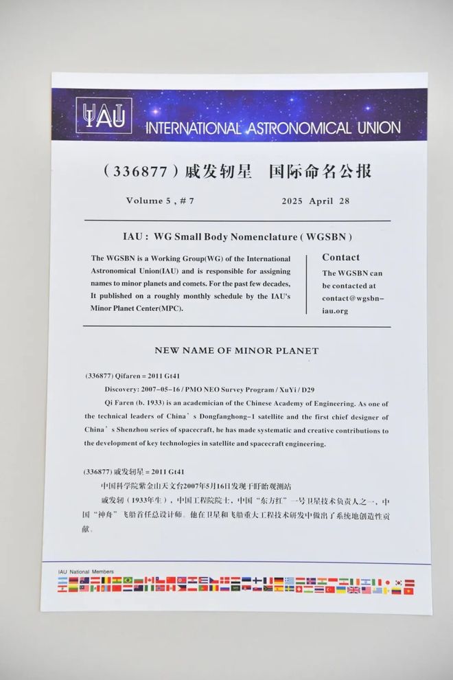 据微信公众号"中国空间技术研究院"消息,12月17日,"戚发轫星"命名仪式暨太空探索开发学术报告会 在该院举行。 仪式现场宣读并颁发了"戚发轫星"国际命名公报及命名证书,由中国科学院紫金山天文台发现的、国际 编号336877号的小行星,经天文学联合会批准,被正式命名为"戚发轫星"。 IAU : WG Small Body Nomenclature ( WGSBN ) The WGSBN is a Working Group(WG) of the International Astronomical Union(IAU) and is responsible for assigning names to minor planets and comets. For the past few decades, It published on a roughly monthly schedule by the IAU's Minor Planet Center(MPC). Contact The WGSBN can be contacted at contact@wgsbn- iau.org RNATIONAL AS ...