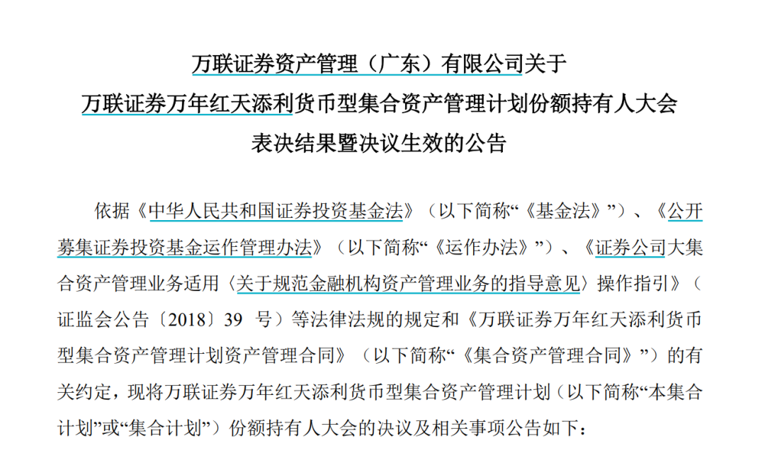 万联证券在公告中表示,表决生效后,对于集合计划份额持有人持有集合计划份额,管理人于11月28日至12月5日设置6个交易日的赎回选 择期。赎回选择期期间,可供集合计划份额持有人做出赎回选择。赎回选择期间未赎回的持有人,其持有的份额将默认结转为平安天添利 货币市场基金的基金份额。 【导读】 平安基金接手万联证券旗下参公大集合产品 中国基金报记者 莫琳 券商资管参公大集合改造,探索出新路径。 11月28日,万联证券公告,万联证券旗下万联天添利货币资管计划变更管理人为平安基金,更名为"平安天添利货币市场基金",平安基金 正式接替万联证券,成为该货币基金的管理人。 这是业内为数不多的跨非股东关系机构间的券商资管参公大集合改造。 据2018年资管新规要求,券商参公大集合须在2025年底前完成公募化改造。随着截止日期临近,券商资管参公大集合改造进入冲刺阶段。 除了万联证券和平安基金联手之外,此前东北证券、财达证券等券商也已公告尝试此类"转公"路径。 11月25日,东北证券旗下的资管公司东证融汇资管公告称,旗下鑫享30天、禧悦90天资产管理计划在11月30日交由东财基金管理。 公告称,本次集合计划份额持有人大会决议生效后,对 ...