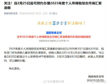 国家税务总局关于2025年度个人所得税汇算清缴的通告 - 2025年度个人所得税综合所得汇算清缴办理时间为2026年3月1日至6月30日 [2] - 税务部门将为纳税人提供预约办理服务 [2] - 通告发布日期为2026年2月3日 [4] 个人所得税App预约办理安排 - 纳税人如需在2026年3月1日至3月20日期间办理汇算清缴,可以自2月25日起通过个人所得税App提前预约 [1][2] - 在2026年3月21日至6月30日期间,纳税人无需预约,可以随时办理 [2]