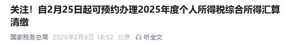 2025年度个人所得税汇算清缴时间安排 - 2025年度个人所得税综合所得汇算清缴的办理时间为2026年3月1日至6月30日[1] - 税务部门将在汇算清缴期间为纳税人提供预约办理服务[1] 预约办理的具体规则 - 对于需要在2026年3月1日至3月20日期间办理汇算清缴的纳税人,可以自2026年2月25日起通过个人所得税App进行提前预约[1] - 在2026年3月21日至6月30日期间,纳税人无需预约,可以随时办理汇算清缴[1]