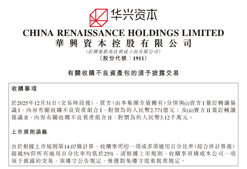 文章核心观点 - 华兴资本以3.08亿元对价收购本息总额74.29亿元的个人消费贷不良资产包,标志着这家以轻资产投行业务闻名的公司正式进军重资产的不良资产处置领域 [1] - 此次收购是华兴资本在传统投行业务面临挑战、公司进行战略转型背景下,为开辟新增长曲线和在新资产管理赛道卡位的关键一步 [4][5] - 不良资产处置市场正吸引包括产业资本在内的多方巨头入场,行业模式不断创新,但该领域具有重资金、长周期、高专业门槛的特点,跨界玩家面临挑战 [7][8] 交易详情 - 收购标的为来自奇富科技的两个个人消费信贷不良资产包,总本息额74.29亿元,总对价3.08亿元,相当于以约4.15%的平均折扣率购入 [1] - 第一个资产包未偿本金66.77亿元,平均逾期854天,逾期一至两年债务占比约20% [2] - 第二个资产包未偿本金7.52亿元,平均逾期439天,逾期一至两年债务占比高达38% [2] - 支付方式分两期:首笔款项占对价的74%,于协议签订后25个营业日内支付;尾款26%于首付款支付后15个营业日内结清 [2] 市场背景与定价 - 2025年一季度,个人消费贷不良资产在银登中心的平均折扣率已跌至3.8%的历史低位 [3] - 市场出现极端低价案例:有消费金融公司以7000万元起拍19.74亿元本息的资产包(折扣约0.35折),有银行机构以1700万元挂牌8.61亿元本息的资产包(折扣率约0.19折)[3] - 华兴资本4.15%的折扣率在当前市场中被视为“不错的价格”[3] - 市场定价受压因素包括:监管规范催收行为导致传统催收与司法催收效果受限,处置难度增加 [3] 华兴资本的转型动因 - 公司传统投行业务面临严峻挑战,财务表现承压:2022年至2024年,总收入从15.8亿元持续下滑至7.8亿元,三年累计亏损超过10亿元 [4] - 2024年公司开启向“科技金融”的战略转型,2025年上半年转型初步见效:净收入同比增长27%至4.6亿元,其中投资管理业务收入同比大幅增长81% [4][5] - 进军不良资产领域旨在开辟新增长曲线,并看好2026年行业前景,以期抢占先机并建立新的资产管理能力 [5] 模式转变与行业挑战 - 业务模式从不动用自身资本、赚取服务费的轻资产投行,转变为需动用真金白银、直接承担风险、依靠资产处置增值赚钱的“持有者”[5] - 不良资产处置业务具有“重资金、长周期”特点,通常需4-6年才能回本,对公司的资金实力与投资耐心构成考验 [5] - 行业普遍痛点包括回收周期长、处置成本高、专业能力要求高 [8] 行业趋势与竞争格局 - 市场供给充裕:2025年三季度末,商业银行不良贷款余额达3.5万亿元,较上季末增加883亿元;不良贷款率微升至1.52% [7] - 互联网巨头早已布局:京东科技曾战略入股北京资产管理公司,阿里与京东分别依托阿里拍卖、京东拍卖构建全国性资产处置平台 [7] - 新兴合作模式涌现:由实力雄厚的投资方作为资金提供方,委托专业的地方资产管理公司作为运营方进行前端筛选、竞购和处置,按约定共享收益,实现资本与能力的优势互补 [1][8]