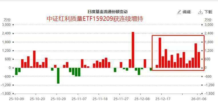 在近期市场风格趋于均衡、无风险利率仍处低位的环境下,"质量红利"策略因其兼具防御属性与成长潜 力,正成为资金进行中长期配置的重要方向之一。该ETF的持续资金流入与强势表现,反映出投资者对 高股息策略进行迭代升级的认可。 风险提示:基金有风险,投资需谨慎。 分析指出,该ETF近期持续受到资金关注,核心在于其独特的"质量红利"策略。与传统红利指数简单依 据股息率选股不同,中证红利质量指数在筛选高股息公司的基础上,进一步融入对企业盈利能力、成长 质量与财务稳健性的综合评估。这种策略在兼顾股息收益的同时,更强调企业的长期经营质量与可持续 增长能力,契合当前市场在经济增长结构转型过程中,对具备稳定现金流、良好治理结构和持续盈利能 力的优质企业的价值重估需求。 1月5日,A股市场整体表现积极,其中以"高质量分红"为核心逻辑的中证红利质量ETF(159209)表现尤 为突出,单日涨幅超2.6%,同时获得超2000万元资金净流入,创下近期单日流入规模新高。据统计, 该ETF已连续14个交易日获得资金净流入,累计净流入额超过1.4亿元。 ...