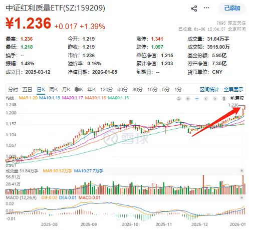 1月6日,市场持续回暖。截至上午10时18分,中证红利质量ETF(159209)上涨1.23%,价格再创历史新 高,其2025年累计涨幅已超20%,领跑A股所有红利类产品。资金热度不减,盘中数据显示,该基金已 实现连续15个交易日资金净流入。 分析指出,资金的持续追逐源于其策略内核的显著进化。该基金跟踪的中证红利质量指数,并非仅追求 高股息率,而是通过融合 "高股息" 与 "高质量" 双因子进行严苛筛选。它在要求企业具备稳定分红能力 的同时,更看重其盈利能力、财务稳健性及长期成长潜力,旨在从各行业中优中选优,其理念更接近 于"以合理价格买入伟大公司"。这使得其在市场情绪转暖时,凭借扎实的基本面,展现出比传统高股息 策略更强的股价弹性与上行空间,实现了 "攻守兼备" 的特性。 在产品设计上,该ETF采用 "0.15%+0.05%" 的全市场最低档费率结构,长期持有成本优势明显。同时, 其月度评估分红机制,能够更好地满足投资者对定期现金流的需求,显著提升持有体验。 风险提示:基金有风险,投资需谨慎。 ...
