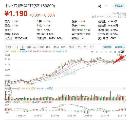 风险提示:基金有风险,投资需谨慎。 12月26日,两市持续回暖。数据显示,截至10时9分,中证红利质量ETF(159209)放量涨0.42%,盘中创年内第48次新高,资金热度不减,盘中 连续10日净流入! 分析指出,当市场风险偏好上行,投资者寻求更具弹性的配置工具。中证红利质量指数融合"高股息"与"高质量"双因子,精准捕捉机遇。其 不仅聚焦稳定分红企业,更严选盈利能力强、财务稳健、具备成长性的优质公司。在积极市场环境中,此类标的凭借扎实基本面和增长潜 力,更易吸引资金集中配置,往往展现出超越单纯高股息策略的股价弹性与上行空间。该指数为布局风险偏好上行期提供了攻守兼备的优质 选择。产品设计层面,中证红利质量ETF(159209)费用模式采用"0.15%+0.05%"的全市场最低档 ,长期持有具备明显的成本优势;分红模式采 用月度评估分红机制,能更好地满足投资者的现金流需求,提升持有体验。 ...