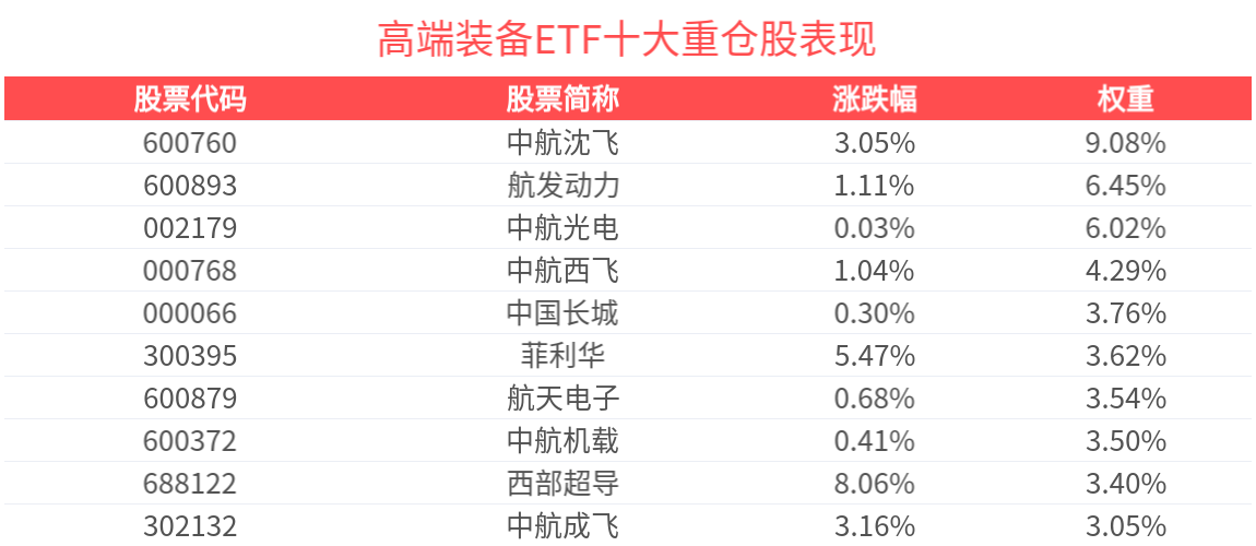截至10月27日,高端装备ETF近6月净值上涨21.30%。从收益能力看,截至2025年10月27日,高端装备ETF自成立以来,最高单月回报为19.30%,最长连涨 月数为4个月,最长连涨涨幅为30.19%,上涨月份平均收益率为6.43%。 截至2025年10月28日 11:15,中证高端装备细分50指数强势上涨1.70%,成分股航天发展上涨9.95%,航天智装上涨8.09%,西部超导上涨8.06%,菲利华,华 秦科技等个股跟涨。高端装备ETF(159638)上涨1.68%, 冲击3连涨。 流动性方面,高端装备ETF盘中换手4.25%,成交4318.42万元。拉长时间看,截至10月27日,高端装备ETF近1年日均成交5794.26万元。规模方面,高端装 备ETF最新规模达10.11亿元。 | 股票代码 | 股票简称 | 涨跌幅 | 权重 | | --- | --- | --- | --- | | 600760 | 中航沈飞 | 3.05% | 9.08% | | 600893 | 航发动力 | 1.11% | 6.45% | | 002179 | 中航光电 | 0.03% | 6.02% | | 000768 ...