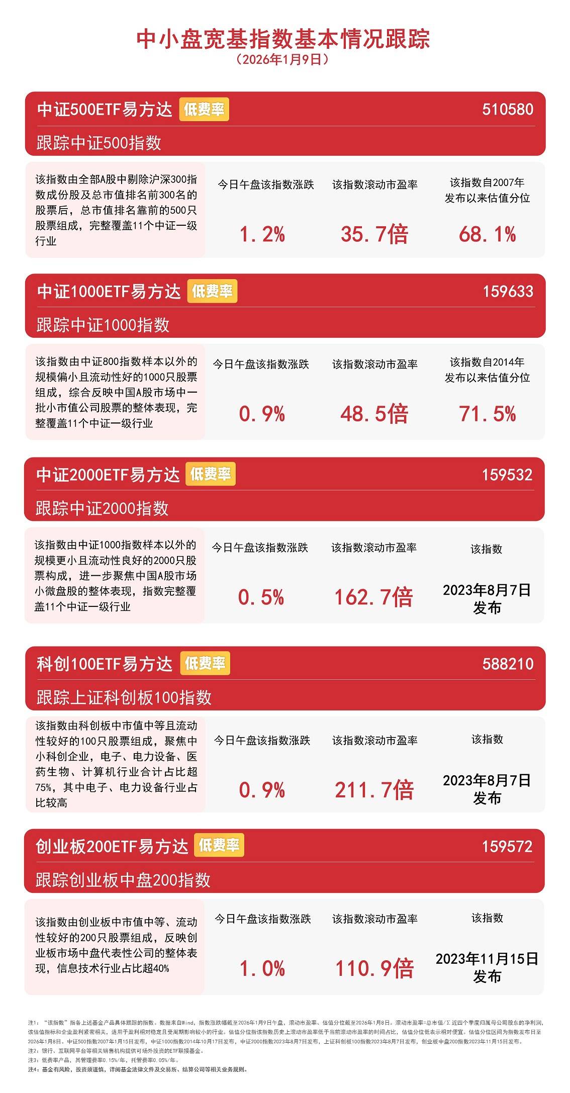 截至午间收盘,中证500指数上涨1.2%,创业板中盘200指数上涨1.0%,中证1000指数、科创100指数均上涨0.9%,中证2000指数上涨0.5%。 | 中证500ETF易方达 | | | 510580 | | --- | --- | --- | --- | | 跟踪中证500指数 | | | | | 该指数由全部A股中剔除沪深300指 | 今日午盘该指数涨跌 | 该指数滚动市盈率 | 该指数自2007年 | | 数成份股及总市值排名前300名的 | | | 发布以来估值分位 | | 股票后,总市值排名靠前的500只 | | | | | 股票组成,完整覆盖11个中证一级 行业 | 1.2% | 35.7倍 | 68. 1% | | 中证1000ETF易方达 低费率 | | | 159633 | | 跟踪中证1000指数 | | | | | 该指数由中证800指数样本以外的 | 今日午盘该指数涨跌 | 该指数滚动市盈率 | 该指数自2014年 | | 规模偏小且流动性好的1000只股票 | | | 发布以来估值分位 | | 组成,综合反映中国A股市场中一 | | | | | 批小市值公司股票的整体表现,完 ...