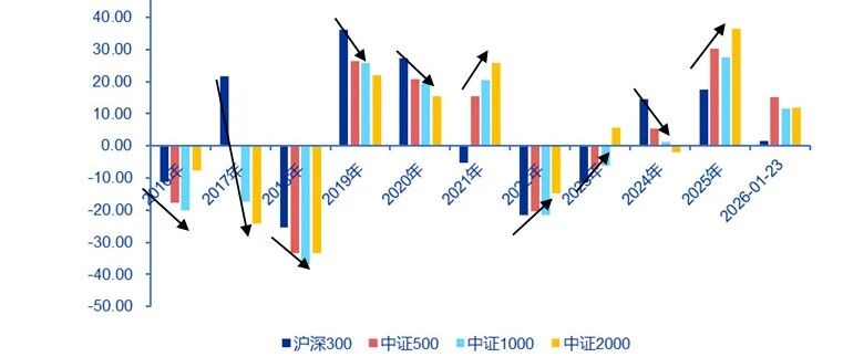 1. 2026 年以来中证 500 指数表现突出 2026 年开始以来,中证 500 指数的表现在主要宽基指数里较为突出,截至 2026 年 1 月 23 日,中证 500 指数已上涨 15.06% ,不仅比同期的沪深 300 、中证 1000 和中证 2000 都更强,也使得今年的主要宽基指数表现出现了罕见的"不单调"情况。 如图 1 所示,由于市值因子长期以来对 A 股的强烈影响,实际上我们可以看到,大部分年份里,沪深 300 到中证 500 再到中证 1000 、中证 2000 的表现是单调 的,即小市值因子强的时候,中证 2000 的表现优于中证 1000 优于中证 500 优于沪深 300 ,典型的年份有 2021 年、 2022 年、 2023 年,或者就是倒过来大市 值强的时候,则是沪深 300 指数优于中证 500 指数优于中证 1000 指数优于中证 2000 指数,典型的也有 2017 年、 2019 年、 2020 年、 2024 年等。 如果 2026 年这种单调性被打破,无疑对于观察市场未来的结构特征及市值因子的规律提供了新的窗口,但毕竟 2026 年刚刚开始了一个月不到,是否会持续 ...