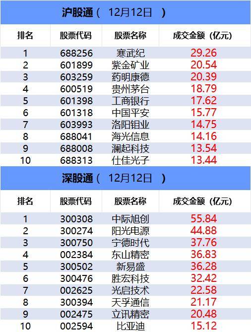 沪深股通今日合计成交3096.84亿,其中寒武纪和中际旭创分居沪股通和深股通个股成交额首位。板块 主力资金方面,电网设备板块主力资金净流入居首。ETF成交方面,中证500ETF(159922)成交额环 比增长258%。 龙虎榜方面,今日触及20cm涨停的联特科技获深股通席位净买入1.07亿,获国泰海通证券上海中山东路 营业部净买入1.48亿,同时获国泰海通证券南京太平南路营业部净买入1.1亿。摩尔线程获摩根大通中国 银城中路营业部买入2.07亿,获平安证券深圳分公司买入0.82亿,同时遭国泰海通证券公司总部卖出 2.22亿,遭高盛证券上海世纪大道营业部卖出2.13亿,遭中金公司上海分公司卖出1.17亿。 一、沪深股通前十大成交 今日沪股通总成交金额为1498.83亿,深股通总成交金额为1598亿。 | | | 沪股通( 12月12日 ) | | | --- | --- | --- | --- | | 排名 | 股票代码 | 股票名称 | 成交金额(亿元) | | 1 | 688256 | 寒武纪 | 29.26 | | 2 | 668109 | 紫等时,不 | 20.54 | | 3 | 603259 | 药 ...