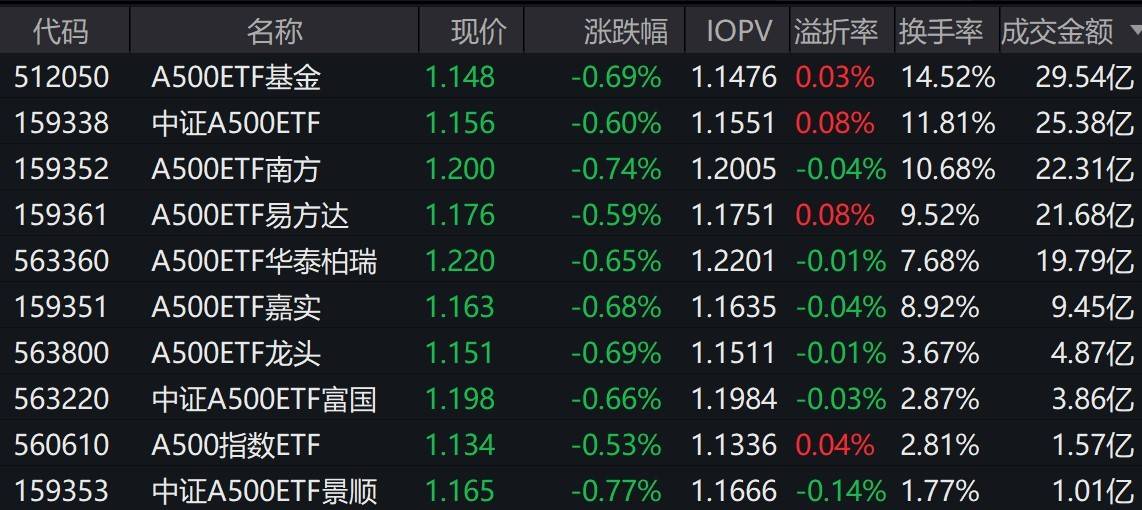市场早盘震荡走弱,中证A500指数下跌1.5%,3只中证A500相关ETF成交额超29亿元