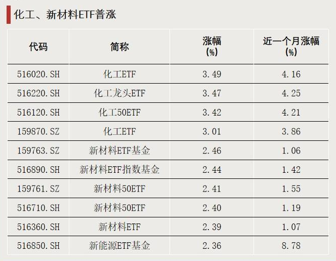 化工及新材料板块表现 - 11月7日化工板块逆势上涨,多只化工ETF涨幅超过3%,其中化工ETF上涨3.49%,化工龙头ETF上涨3.47%,化工50ETF上涨3.42% [1][4][5] - 同日新材料及光伏ETF表现强劲,多只新材料ETF涨幅超过2%,新材料ETF基金上涨2.46%,新材料50ETF上涨2.41% [4][5] - 新能源ETF基金近一个月涨幅达8.78%,表现突出 [5] 港股ETF资金流向 - 11月3日至11月6日,多只港股ETF资金净流入居前,恒生科技ETF净流入21.31亿元,港股创新药ETF净流入13.42亿元 [2][8][9] - 同期证券ETF净流入25.34亿元,银行ETF净流入14.31亿元,电网设备ETF净流入9.60亿元 [9] - 近200亿元资金加仓ETF,主要流向港股及行业主题ETF [9] 中证A500ETF交投活跃 - 11月7日成交额前5的A股ETF均为中证A500ETF,A500ETF基金成交50.28亿元,中证A500ETF成交45.65亿元 [6][7] - 截至11月6日,4只中证A500ETF规模超200亿元,华泰柏瑞基金旗下产品规模达264.63亿元,易方达、国泰、南方基金旗下产品规模分别为240.98亿元、225.17亿元、219.82亿元 [6] - 近半个月易方达和国泰旗下中证A500ETF成交活跃度大幅提升 [6] 创新药板块前景 - 9月以来港股创新药板块持续回调,相关指数较高点跌幅超18% [3][11] - 机构认为创新药行情有望再次启动,因调整充分、龙头品种进入绝对收益区间且无边际利空消息 [3][11] - 2025年三季度创新药板块业绩显著超预期,在产品放量、BD合作及全球化推进下保持强劲增长 [12] - 多家机构建议关注创新药配置机会,因企业业绩亮眼、重要国际会议如SITC年会或将成板块催化剂 [12]