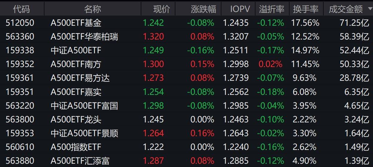 市场整体表现 - 三大指数涨跌不一,沪指震荡拉升,创业板指走势较弱,中证A500指数上涨0.07% [1] - 化工板块近期反复走强,玻纤概念快速拉升,有色金属板块表现活跃 [1] - 影视院线概念遭重挫 [1] 中证A500指数ETF交易情况 - 截至上午收盘,场内跟踪中证A500指数的ETF涨跌互现 [1] - 有11只中证A500相关ETF成交额超1亿元,2只超58亿元 [1] - A500ETF基金早盘成交额为71.25亿元,A500ETF华泰柏瑞早盘成交额为58.39亿元 [1] 主要中证A500指数ETF数据 - A500ETF基金(代码512050)现价1.242元,下跌0.08%,IOPV为1.2435元,溢折率-0.12%,换手率17.56% [2] - A500ETF华泰柏瑞(代码563360)现价1.320元,上涨0.08%,IOPV为1.3207元,溢折率-0.05%,换手率12.52% [2] - A500ETF南方(代码159352)现价1.300元,上涨0.15%,IOPV为1.2998元,溢折率0.02%,换手率11.45% [2] - 中证A500ETF(代码159338)现价1.249元,下跌0.16%,IOPV为1.2511元,溢折率-0.17%,换手率14.97% [2] - A500ETF易方达(代码159361)现价1.273元,上涨0.08%,IOPV为1.2739元,溢折率-0.07%,换手率9.63% [2] 市场观点 - 有券商表示,短期内节前交投活跃度可能继续趋于平稳 [1] - 在海外扰动减少、部分题材板块利好事件较多的背景下,市场情绪或仍保持回暖趋势 [1] - 大盘主要将以结构性机会为主,投资者可聚焦当前市场热点题材板块 [1]