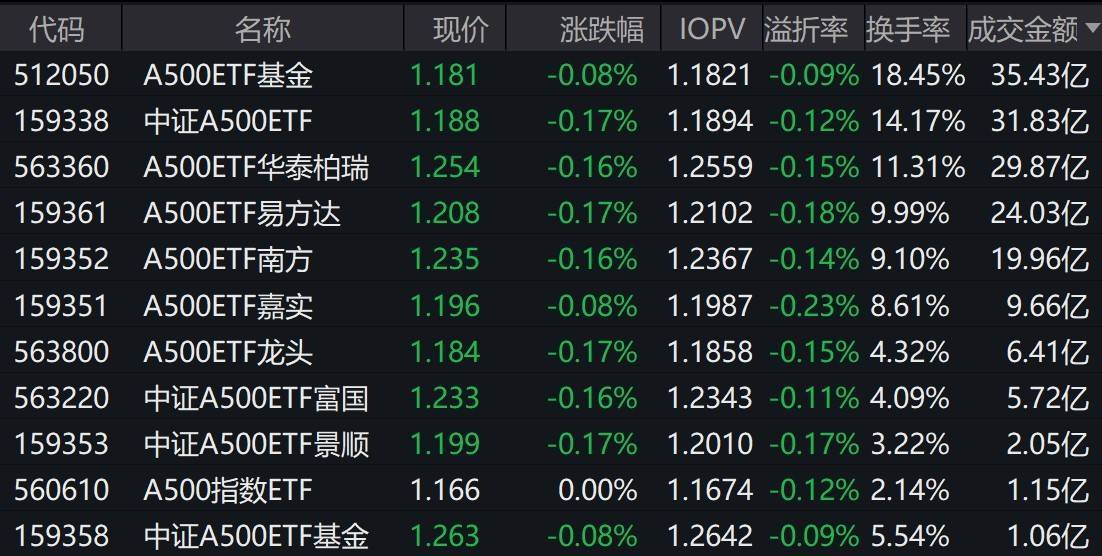 市场早盘震荡下跌,创业板指跌超2%,中证A500指数下跌0.33%。 有券商表示,第四季度机构资金存在一定止盈高估值板块的动力,市场风格有望走向再平衡。中期来看,在全球科技投资热情不减、"反内卷"政策持 续推进、居民储蓄入市等因素支撑下,本轮慢牛行情的根基并未动摇,后续A股指数仍存在继续走强的基础。 | 代码 | 名称 | 现价 | 涨跌幅 | IOPV 溢折率 换手率 成交金额▼ | | --- | --- | --- | --- | --- | | 512050 | A500ETF基金 | 1.177 | -0.34% | 1.1772 -0.02% 18.49% 35.83亿 | | 159338 | 中证A500ETF | 1.183 | -0.42% | 1.1842 -0.10% 14.49% 32.26亿 | | 563360 | A500ETF华泰柏瑞 | 1.251 | -0.40% | 1.2507 0.02% 11.46% 29.91亿 | | 159361 | A500ETF易方达 | 1.205 | -0.33% | 1.2049 0.01% 11.40% 27.11亿 | | 15 ...