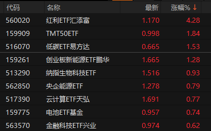 11月18日,ETF开盘涨跌不一,红利ETF汇添富(560020)领涨4.28%,TMT50ETF(159909)涨 1.84%,低碳ETF易方达(516070)涨1.53%,中银上海金ETF(518890)领跌2.15%,日经225ETF (513880)跌2.14%,日经225ETF易方达(513000)跌1.99%。 | 代码 | 名称 | 最新 | 涨幅% 1 | | --- | --- | --- | --- | | 560020 | 红利ETF汇添富 | 1.170 | 4.28 | | 159909 | TMT50ETF | 0.998 | 1.84 | | 516070 | 低碳ETF易方达 | 0.665 | 1.53 | | 159261 | 創小板新能源ETF勝华 | 1.665 | 1.28 | | 513290 | 纳指生物科技ETF | 1.516 | 0.93 | | 562850 | 央企能源ETF | 1.278 | 0.79 | | 517390 | 云计算ETF天弘 | 1.691 | 0.77 | | 159775 | 电池ETF基金 | 0.957 | 0.74 | ...
