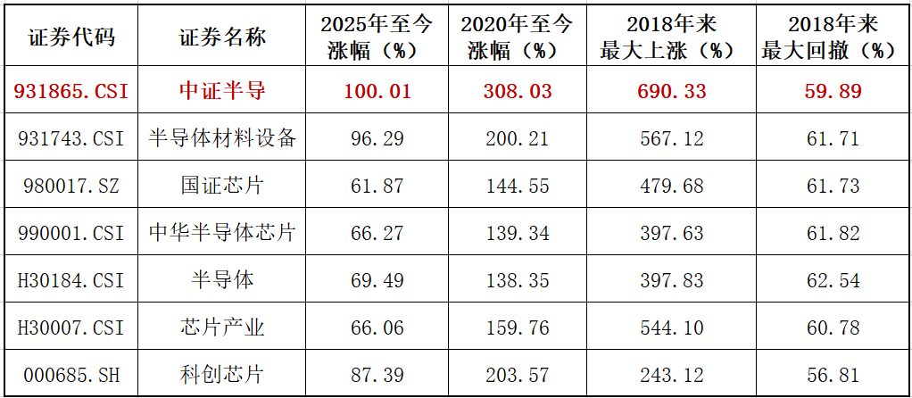 国产半导体设备技术突破 - 我国首台串列型高能氢离子注入机(POWER-750H)成功出束,核心指标达到国际先进水平,标志着已全面掌握该设备的全链路研发技术,攻克了功率半导体制造关键环节 [1] - 离子注入机与光刻机、刻蚀机、薄膜沉积设备并称为芯片制造“四大核心装备”,是半导体制造不可或缺的“刚需”设备 [1] - 长期以来,我国高能氢离子注入机完全依赖国外进口,其研发难度大、技术壁垒高,是制约产业升级的瓶颈之一 [1] 半导体设备国产化进程 - 根据中国半导体行业协会数据,按照S型增长曲线(导入期0-10%,加速期10%-40%,成熟期40%-80%),我国设备国产化或已进入加速期的核心爬坡段 [1] 行业龙头扩产与需求驱动 - 全球最大芯片代工厂商台积电2025年第四季度净利润同比增长35%,毛利率高达62%,均大幅好于预期 [2] - 台积电预计2026年资本支出最高将达560亿美元 [2] - AI需求高增导致先进制程供需失衡,根据Trend Force数据,2025年全年存储芯片细分领域价格最高涨幅达1800%,预计2026年一季度最高涨60% [2] 行业景气周期与投资机会 - AI驱动存储涨价周期,叠加先进制程技术升级驱动国产晶圆厂产能利用率高增,半导体设备和材料需求增长强劲 [2] - 国产半导体设备及材料等产业可能正迎来“扩产周期+技术突破”双重共振的黄金期 [2] - 半导体设备ETF(561980)跟踪中证半导指数,该指数在芯片产业链上/中游设备、材料、芯片设计三行业占比超90% [2] - 中证半导指数前五大集中度、前十大集中度在同类可比半导体指数中均位居第一 [2] - 指数重点覆盖中微公司(刻蚀设备)、北方华创(多领域设备)、中芯国际(制造龙头)、海光信息、寒武纪(AI芯片设计)、南大光电(半导体材料)等核心领域龙头 [2] 相关指数表现对比 - 对比同类主题指数,中证半导指数呈现更高弹性,2025年至今涨幅率先实现翻倍,达100.01% [3][4] - 中证半导指数2020年至今上涨308.03%,大幅跑赢科创芯片指数(203.57%) [3][4] - 中证半导指数自上一轮半导体周期(2018年)至今最大涨幅超690.33%,在所列同类指数中位居第一 [3][4] - 其他主要半导体指数同期表现:半导体材料设备指数2018年来最大上涨567.12%,国证芯片指数最大上涨479.68%,中华半导体芯片指数最大上涨397.63% [4]