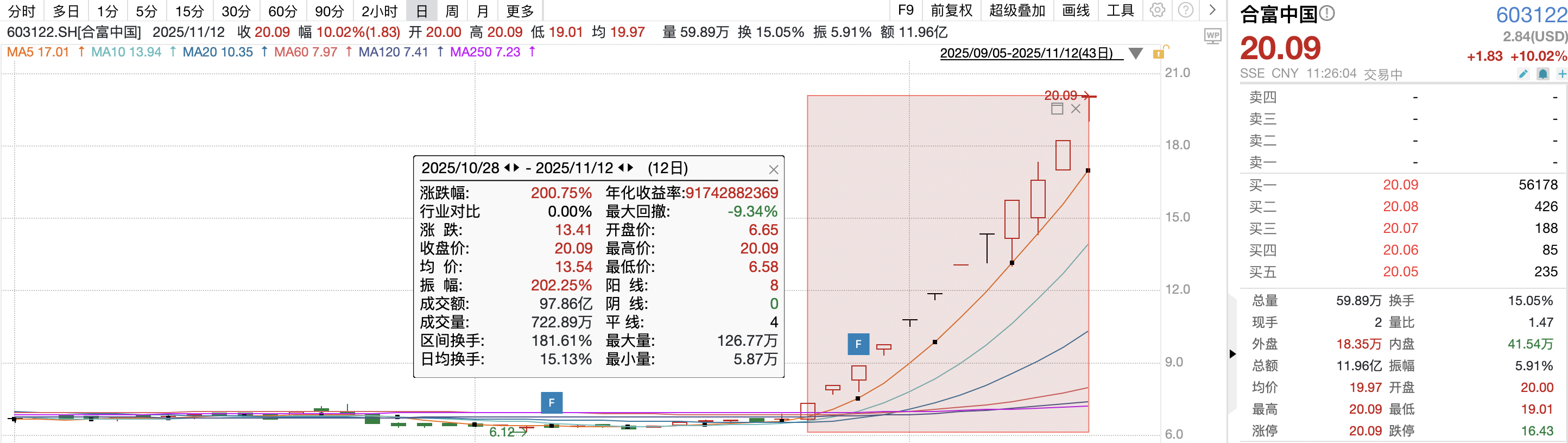 在业绩持续亏损的情况下,合富中国(603122.SH)却走出了"12天11板"行情。 11月12日,合富中国股票开盘涨停,中间虽一度打开涨停板,但随后再度涨停。截至午间收盘,Wind数据显示,合富中国 股票从10月28日的6.65元/股一路飙升至11月12日的20.09元/股,累计涨幅高达200.75%,总市值也从不足30亿元膨胀至80亿元。 | 90分 2小时 | 分时 多日 1分 5分 15分 | 30分 | 60分 | 日 間 月 更多 | | | --- | --- | --- | --- | --- | --- | | 603122.SH[合富中国] 2025/11/12 收 20.09 幅 10.02%(1.83) 开 20.00 高 20.09 低 19.01 | | | | | | | MA5 17.01 ↑ MA10 13.94 ↑ MA20 10.35 ↑ MA60 7.97 ↑ MA120 7.41 ↑ MA250 7.23 ↑ | | | | | | | 2025/10/28 ◀▶ - 2025/11/ | | | | | | | 涨跌幅: | | | | | 200.75% | | ...