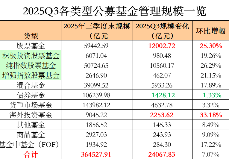 2025年三季度公募基金行业整体规模 - 全市场公募基金管理总规模达36.45万亿元,较二季度末增长2.41万亿元,环比增幅7.07% [2][3] - 除债券基金外,其余各类基金均实现正增长,债券基金规模单季度减少1428亿元,环比下降1.33%,是唯一规模缩水的类型 [1][2][3] - 货币市场基金规模增长4633亿元至14.40万亿元,增幅3.32% [2][3] 权益类基金规模表现 - 权益基金规模大幅增长,股票基金规模环比增加1.2万亿元,增幅达25.3%,混合基金规模增长近6000亿元,增幅17.89% [2] - 主动权益类基金(含积极投资股票基金和混合基金)规模增长近7000亿元,股票型指数基金(含纯指数和增强指数)规模增长1.1万亿元 [1][2] - 纯指数股票基金规模单季度新增1.06万亿元,是股票基金中增幅最大的细分品类,环比增长26.29% [2][3] 其他类别基金规模变化 - 海外投资基金规模增加2254亿元,增幅33.18%,位列各类基金增幅首位 [3] - 商品基金规模增长244亿元,增幅超过9%,基金中基金(FOF)规模增幅达17.22% [4] - 其他基金规模增长145亿元,增幅8.49% [3] 基金管理公司非货规模排名 - 易方达基金非货币基金规模为1.81万亿元,位居全市场第一,华夏基金以1.52万亿元名列第二 [5][6] - 广发基金、富国基金、南方基金、嘉实基金非货规模分别位列第三至第六位,规模在8000亿至1万亿元之间 [5][7] - 华泰柏瑞基金、博时基金、汇添富基金、景顺长城基金跻身前十,规模均超过5000亿元 [5][7] 基金管理公司规模增长 - 五家公募三季度非货规模增长超千亿元,易方达基金激增2866亿元(增幅18.82%),华夏基金增长1951亿元(增幅14.71%),富国基金增长1541亿元(增幅20.12%) [8][9] - 南方基金和华泰柏瑞基金非货规模也增长超1000亿元,分别增长1074亿元和1052亿元 [8][9] - 汇添富、景顺长城、广发、国泰等11家公司三季度非货规模增长均超过500亿元 [9] 权益类基金公司规模排名 - 易方达基金权益类基金规模达12910亿元位居第一,华夏基金11525亿元第二,华泰柏瑞基金6669亿元第三 [11][12] - 广发基金、嘉实基金、南方基金权益类规模均超过5000亿元,富国、汇添富、国泰、中欧基金规模分列第七至第十位 [11][12] - 权益类基金增量方面,易方达基金增长2757亿元居首,华夏基金增长1977亿元第二,广发、富国、汇添富基金增量均超千亿元 [14][15] 指数产品发展 - 全市场公募指数产品规模逼近8万亿元,其中非货币ETF规模近5.5万亿元,ETF联接基金规模0.9万亿元,其他场外指数基金规模近1.6万亿元 [16] - 易方达基金指数产品规模约1.11万亿元,华夏基金约1.08万亿元,两家公司指数基金规模突破万亿元大关 [1][16] - 华泰柏瑞基金指数产品规模达0.6万亿元 [16] 主动权益类基金规模 - 易方达基金主动权益基金规模3129亿元位列第一,中欧基金2448亿元、广发基金2333亿元、富国基金2129亿元分列第二至第四位 [17][18] - 汇添富、华夏、景顺长城、嘉实基金主动权益规模均超1500亿元,兴证全球、南方基金规模超1000亿元跻身前十 [17][18] - 中欧、易方达、永赢基金三家公司主动权益基金增长超500亿元,永赢基金增幅达125.99%,规模接近千亿 [19][21]