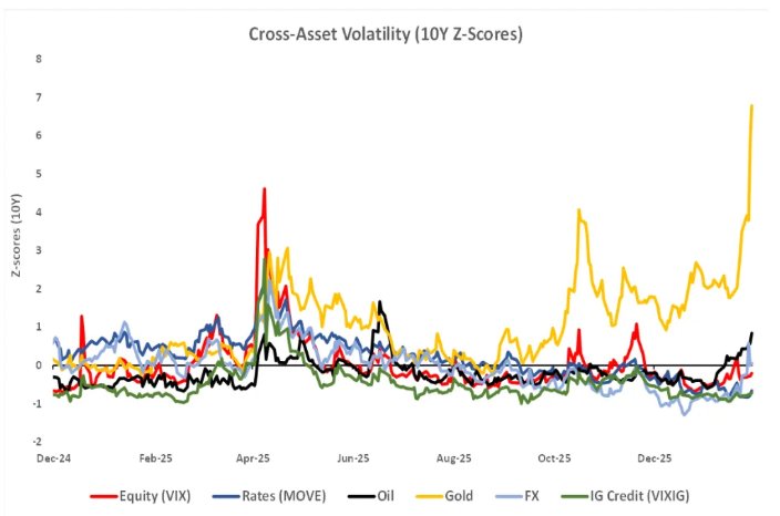 股票市场波动性特征 - 2026年第一个月,股票市场整体波动性较低,芝加哥期权交易所波动率指数低于过去一年的平均水平[1] - 股票市场的波动主要体现在个股层面,例如微软公布财报后股价下跌了10%,但股指波动性受到抑制[3] - 股票分散度处于高位,个股走势各异降低了相关性,从而抑制了整体波动性指标[3] - 标普500指数期权期限结构向上倾斜,表明市场短期内担忧不大[10] 贵金属市场动态 - 黄金价格在2026年1月飙升至历史新高,随后遭遇自上世纪80年代以来最大幅度的下跌,单日下跌9%[1][3] - 金价创下1999年以来最大的月度涨幅,其绝对价格、ETF看涨期权交易量以及相对于股票的波动率均创下历史新高[3] - 黄金的上涨呈现“波动率上升/现货价格上涨”的动态,交易员大量资金投入黄金ETF,仅SPDR黄金信托基金在过去八个月就积累了超过200亿美元的规模[3] - 贵金属不再被视为避险资产,SPDR黄金信托基金的隐含波动率相对于标普500指数达到了历史最高水平[6] - 黄金与股票的相关性过去接近零,但随着资金流入,目前已略有上升[6] 外汇与大宗商品市场波动 - 美元跌至自4月份关税引发市场暴跌以来的最大跌幅,市场猜测美国将干预汇率以提振日元[1] - 美元兑日元汇率在短短几天内下跌超过4%,其隐含波动率飙升[7] - 原油价格飙升至8月份以来的最高水平[1] - 金价随美元兑日元汇率上涨已成为最热门的交易策略之一,机构投资者积极进行相关利率交易[7] 市场驱动因素与交易行为 - 地缘政治风险是当前市场波动加剧的主要驱动因素,体现在黄金、石油和外汇市场的大幅波动[1] - 股票投资者关注盈利和人工智能交易的持久性[3] - 美国银行专有的泡沫风险指标已达到极端水平,这种水平在过去曾与重大波动有关[3] - 交易员利用二元期权和混合期权来押注黄金与股票之间的关系[6] - 交易员押注货币波动幅度将扩大[7] 其他资产类别反应 - 特朗普提名凯文·沃什担任美联储主席后,金属价格下跌,市场波动性依然居高不下[6] - 沃什的任命似乎戳破了此前因美元贬值预期而膨胀的黄金和白银泡沫[10] - 债券市场反应更为平静,投资者乐于通过iShares20年以上期限美国国债ETF的股票期权做空长期美国国债的波动性[10] - 担保隔夜融资利率的期权表明美国降息的可能性正在缩小,隐含波动率处于多年来的低位[10]