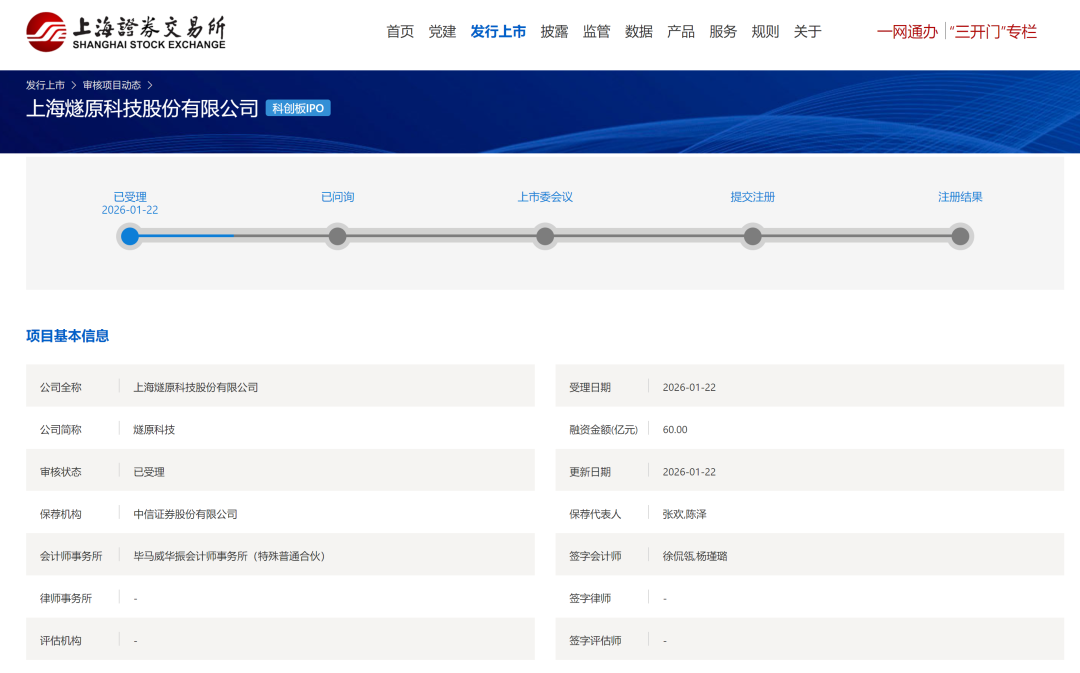 上海燧原科技股份有限公司科创板IPO获上交所受理,公司拟融资金额60亿元。 | | | | 首页 党建 发行上市 披露 监管 数据 产品 服务 规则 关于 | | 一网通办 "三开门"专栏 | | --- | --- | --- | --- | --- | --- | | 发行上市 > 审核项目动态 > | | | | | | | 上海燧原科技股份有限公司 ■创板IPO | | | | | | | 已受理 2026-01-22 | | 已问询 | 上市委会议 | | 提交注册 注册结果 | | 项目基本信息 | | | | | | | 公司全称 | 上海燧原科技股份有限公司 | | | 受理日期 | 2026-01-22 | | 公司简称 | 燧原科技 | | | 融资金额(亿元) | 60.00 | | 审核状态 | 已受理 | | | 更新日期 | 2026-01-22 | | 保荐机构 | 中信证券股份有限公司 | | | 保荐代表人 | 张欢,陈泽 | | 会计师事务所 | 毕马威华振会计师事务所(特殊普通合伙) | | | 签字会计师 | 徐侃瓴,杨瑾璐 | | 律师事务所 | | | | 签字律师 ...