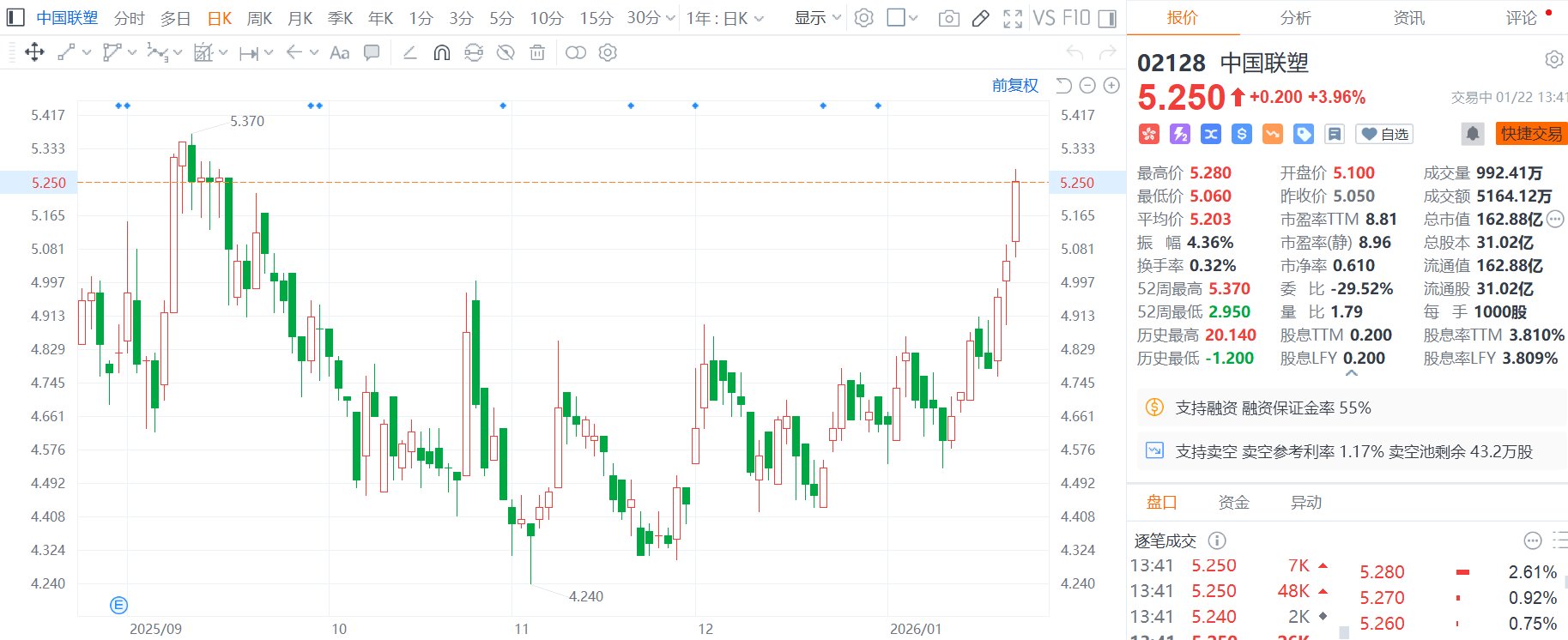 公司股价表现 - 中国联塑(2128.HK)股价于1月22日高开高走,上涨3.96%至5.25港元,公司总市值达162.88亿港元 [1] - 公司股价在最近3个交易日内累计涨幅接近10% [1] 行业核心观点 - 消费建材行业龙头公司的收入和利润已率先修复,存在阿尔法投资机会 [1] - 消费建材行业长期需求稳定性好,行业集中度持续提升,竞争格局良好,优质龙头中长期成长空间很大 [1] - 下游地产行业仍在寻底,等待销售企稳好转,但核心龙头公司经营韧性强 [1] - 建议重视当前的地产链行情,看好消费建材核心标的 [1] 细分领域与投资逻辑 - 针对2026年,看好地产开工端,市场对开工端预期较低,防水、塑料管等开工端建材估值处于相对低位,在政策催化下易产生超预期表现 [1] - 中长期看好存量翻新市场,居民改善居住条件的诉求将随收入预期好转而逐步体现 [1] - 后周期的涂料、五金、瓷砖、板材等品类将充分受益于存量翻新趋势 [1] 机构关注标的 - 广发证券研报建议关注东方雨虹、中国联塑、北新建材、伟星新材等公司 [1] - 上海申银万国证券研报同样建议关注东方雨虹、北新建材、伟星新材、中国联塑等消费建材个股 [1]