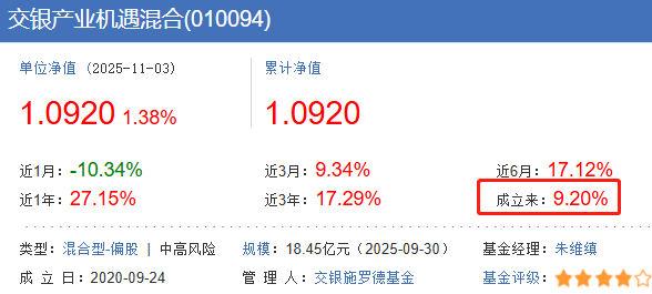 数据显示,该基金成立于2020年9月24日,但截至2025年11月3日,其累计收益率却仅有9.20%。 中国经济网北京11月4日讯在刚过去的10月份里,交银施罗德基金旗下的交银产业机遇混合以-11.57%的表 现成为单月混基跌幅榜第18名。 基金经理变动一览 | 起始期 | 載止期 | 基金经理 | 任职期间 | 任职回报 7 | | --- | --- | --- | --- | --- | | 2024-06-29 | ਦੇ ਦੇ | 朱维蕴 | 1年又128天 | 44.98% | | 2024-06-22 | 2024-06-28 | 田或龙 朱维填 | 67 | -3.31% | | 2020-09-24 | 2024-06-21 | 田或龙 | 3年又271天 | -22.10% | 今年三季报显示,交银施罗德产业机遇混合的前十大重仓股为吉比特(603444)、恺英网络(002517)、 泡泡玛特、腾讯控股、快手、巨人网络(002558)、金山办公、贝壳、李宁、ST华通(002602)。 不过,从历任基金经理的任职回报看,这样逊色的收益率主要由前任基金经理田彧龙造成,而现任基金经 理朱维缜在管理不 ...