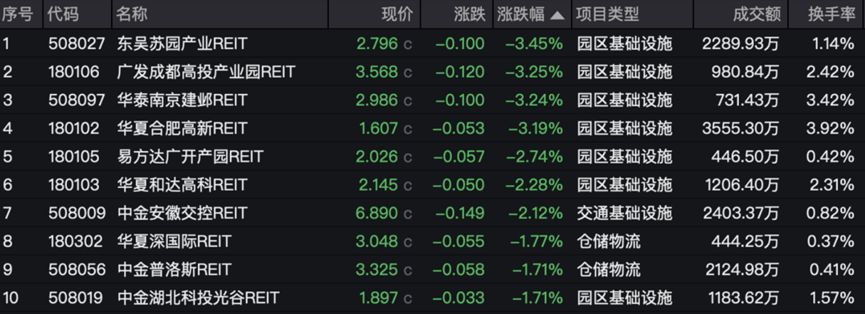 部分产业园区REITs价格连续多日出现下滑,还有产品因单日跌幅超过5%而发布交易情况提示公告,表明基金投资的基础设施项目经营稳 定、基金投资运作正常等,引发行业关注。 有业内专家告诉《每日经济新闻》记者,产业园区类REITs近期的下跌是受到了基金三季报的影响,并且这类资产的基本面恶化与运营承 压并不是新近发生的。"从去年以来,各家产业园区REITs或多或少都采取了一定的'以价换量'的策略,但是成效不一。" 产业园区REITs承压,有产品单日下跌超5% 11月3日,公募REITs二级市场呈下跌态势。中证REITs(收盘)指数和中证REITs全收益指数环比均下跌0.63%,已上市的76只产品中有58 只出现下跌。 值得一提的是,跌幅前十的产品中,产业园区REITs独占7席,其中有4只产品单日跌幅都超过3%。 | 序号 | 代码 名称 | 现价 | | 涨跌 涨跌幅 ▲ 项目类型 | 成交额 | 换手率 | | --- | --- | --- | --- | --- | --- | --- | | 1 | 508027 东吴苏园产业REIT | 2.796 c | -0.100 | -3.45% 园区基础设施 | ...