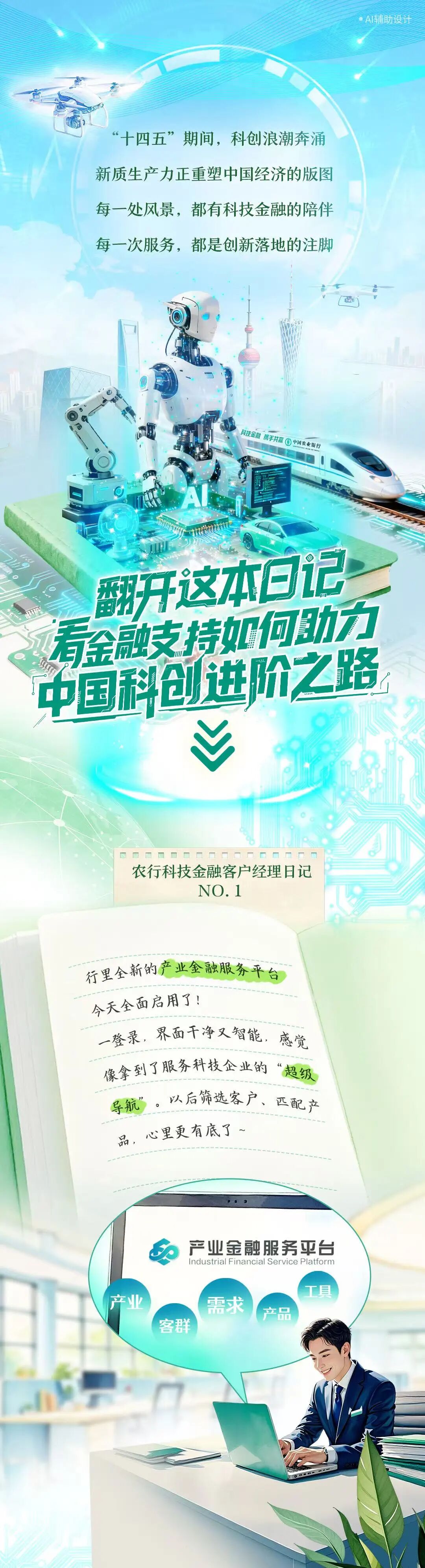 AI辅助设计 "十四五"期间,科创浪潮奔涌 新质生产力正重塑中国经济的版图 每一处风景,都有科技金融的陪伴 每一次服务,都是创新落地的注脚 FU III W HS # F p国科创计 COSE COD CODE COLOC 农行科技金融客户经理日记 NO. 1 行里全新的产业金融服务平台 今天全面启用了! 一登录,界面干净又智能,感觉 像拿到了服务科技企业的"超级 导航"。以后筛选客户、匹配产 品,心里更有底了 ~ 产业务部服务立台 Industrial Financial Service Platform NIT 解求 容 : 1 A C C B B O D C C C C C C C C . 农行科技金融客户经理日记 NO. 2 今天跑了家做人形机器人的企业。 光板因为缺抵押。一直贷不下来。 聊着聊着较发现,他们团队其实有。 不少核心专利。我告诉他,现在农行 太专门服务科技企业的体系 专利资质到未来风下区 一样 从研发实力、 "技术家底" 京 综合评估 能申请贷款。 这批资金真是解了燃眉之急! 我们的专利真正被盘活了! "十四五"期间,我国机器人产业加速发展, 2024年我国机器人专利申请量占全球机器人 ...
