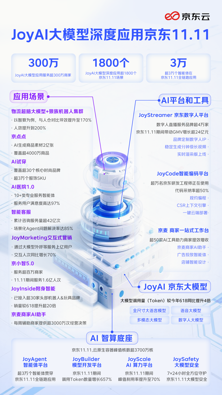 JoyAI大模型深度应用京东11.11 全场景应用:JoyAI重塑超级供应链,释放增长新动能 在京东内部,AI的应用已从单点尝试走向全域覆盖,成为提升运营效率、降低综合成本的关键力量。 以商家运营为例,曾经最费工费时的商品素材生成,通过京点点平台,可以实现秒级的批量生成,在京 东11.11期间,京点点累计生产了2亿张商品图,已覆盖超4000万商品,帮助商家快速丰富营销素材库; 当商家纠结如何制定运营活动时,京麦商家AI助手可以结合店铺历史数据给出经营建议,每周它都会 辅助京东商家提供超3000万次经营决策。在物流运输上,物流超脑大模型搭配狼族机器人集群极大提升 了运输效率,与人仓对比存储坪效提升了200%,人效提升到300%。 在消费端,AI的价值不止于效率,有温度的交互为用户带来情绪价值,也让商家收入增长。京东11.11 期间,京东智能客服累计咨询服务量超42亿次,价保、活动、外卖售后等场景化Agent问题解决率达 85%;作为京东百万商家正在使用的智能客服和导购助手,京小智5.0在京东11.11期间累计服务1.6亿 次,为用户精准找到心仪商品。在一个深夜,飞鹤京东自营旗舰店的智能客服京小智,在面对一位焦虑 ...