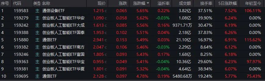 AI(人工智能)算力概念爆发,通信等主题ETF(交易型开放式指数基金)再度领涨全场ETF。 今年以来,随着算力概念的持续火爆,通信、人工智能等板块表现一直强势。Wind数据显示,截至12月8日,申万一级行业 指数中,通信指数以79.14%的涨幅位居第二。 相关主题ETF顺势成为年内领涨产品,截至12月8日,国泰通信设备ETF、富国通信设备ETF成为年内目前唯二涨幅翻倍的 ETF,分别上涨115.62%和106.11%,国泰基金、南方基金、华宝基金旗下创业板人工智能ETF年内均涨超97%。 除上述热门主题ETF外,含"科"量较高的主题ETF年内涨幅同样居前,包括5G、算力等主题ETF。与此同时,部分主题ETF 被资金持续加码,易方达人工智能ETF年内上涨65.5%,获净流入超70亿元。 行业延续高景气 通信ETF领涨 光模块概念股集体爆发,多股涨超10%,部分刷新历史新高。板块带动下,多只通信、人工智能、5G等主题ETF同步大 涨。数据显示,截至12月8日收盘,富国通信设备ETF上涨5.65%,华安基金、大成基金、国泰基金旗下创业板人工智能ETF 均涨超5%。 | 序号 代码 | | 类型 名称 | 现价 | ...