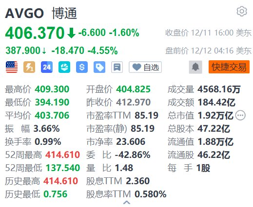 | AVGO 博通 | | | | --- | --- | --- | | 406.370 ↓ -6.600 -1.60% | | 收盘价 12/11 16:00 美东 | | 387.900 + -18.470 -4.55% | | 盘前价 12/12 04:16 美东 | | 一 24 4 2 8 8 8 8 0 | | ● 快捷交易 | | 最高价 409.300 | 开盘价 404.825 | 成交量 4568.16万 | | 最低价 394.190 | 昨收价 412.970 | 成交额 184.42亿 | | 平均价 403.706 | 市空率 85.19 | 总市值 1.92万亿 (…) | | 振 幅 3.66% | 市盈率(静) 85.19 | 总股本 47.22亿 | | 换手率 0.99% | 市净率 23.606 | 流通值 1.88万亿 | | 52周最高 414.610 委 比 -42.86% | | 流通股 46.22亿 | | 52周最低 137.540 量 比 1.48 | | 每 手 1股 | | 历史最高 414.610 股息TTM 2.360 | | | | 历史最低 ...