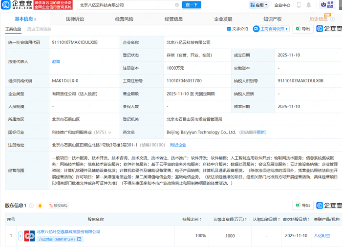 公司基本信息 - 北京八亿云科技有限公司于2025年11月10日成立,法定代表人为赵雷,注册资本为1000万元人民币 [1][2] - 公司登记状态为存续,企业类型为有限责任公司,注册地址位于北京市石景山区 [2] - 公司所属行业为科技推广和应用服务业,英文名称为Beijing Baiyiyun Technology Co, Ltd [2] 股权结构与母公司 - 该公司由A股上市公司八亿时空液晶科技股份有限公司全资持股,持股比例为100% [1][2] - 母公司八亿时空的股票代码为688181 [1][2] 业务经营范围 - 公司经营范围聚焦于高科技服务,主要包括人工智能应用软件开发、物联网技术服务、数据处理服务及云计算设备销售 [1][2] - 其他业务涵盖技术服务、技术开发、技术咨询、软件销售、信息系统集成服务及云计算相关业务 [2] - 公司拥有电信业务经营许可,包括第一类增值电信业务、第二类增值电信业务和基础电信业务 [2]