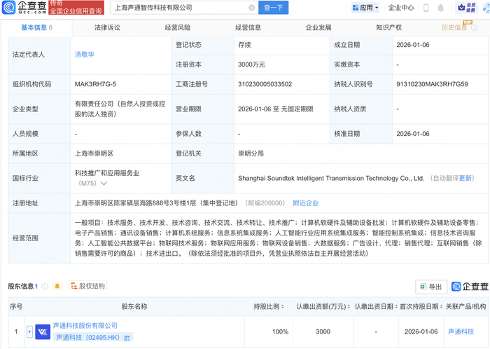 | 全国企业信用查询 | 上海声通智传科技有限公司 造一下 ■应用 · 企业中心 0.50 12 2 2 8 49 | | | --- | --- | --- | | 基本信息 6 法律诉讼 | 经营风险 经营信息 企业发展 知识产权 历史信息 | | | | 2026-01-06 | | | 组织机构代码 MAK3RH7G-5 | 工商注册号 310230005033502 纳税人识别号 91310230MAK3RH7G59 | | | 有限责任公司(自然人投资或控 | | | | 人员规模 | 参保人数 核准日期 | | | 上海市资明区 | 登记机关 張明分局 | 所属地区 | | 科技推广和应用服务业 (M75) V | 英文名 Shanghai Soundtek Intelligent Transmission Technology Co., Ltd. (自动翻译更新) | 国标行业 | | 注册地址 | 上海市崇明区陈家镇层海路888号3号楼1层(集中登记地)(邮编200000) 附近企业 | | | | 销售需要许可的商品);技术进出口。(除依法须经批准的项目外,凭营业执照依法自主开展经营活动) ...