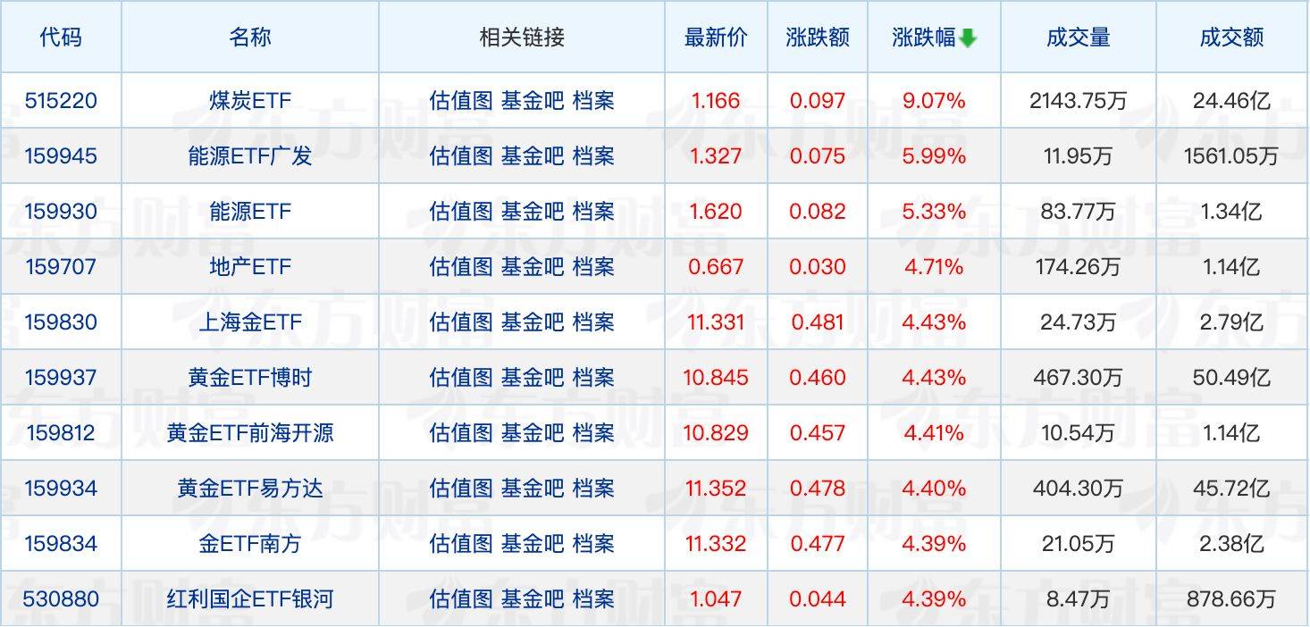 ETF今日收评 | 煤炭ETF涨超9%,能源相关ETF涨超5%,人工智能ETF跌超4%