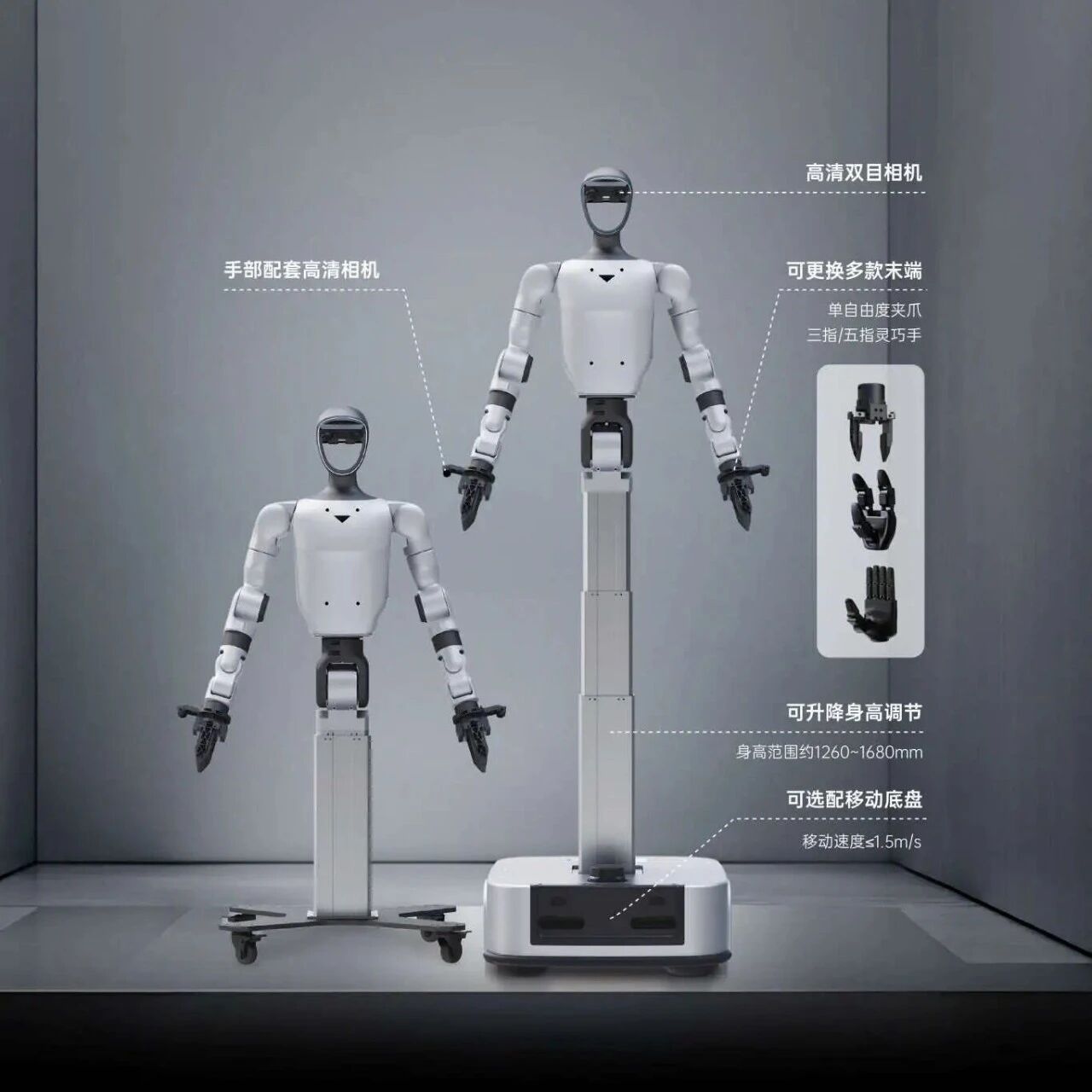 G1-D机器人身高范围约1260-1680mm,头部配备高清双目相机,手部配备高清相机。G1-D分为通用版 和旗舰版,旗舰版可选配移动底盘,移动速度在1.5m/秒以内。 G1-D通用版和旗舰版分别有17和19个整机自由度(不含末端),单臂自由度(不含末端)为7个,单臂最大 负载约为3kg。G1-D采用轮式与升降相结合的移动升降设计,垂直作业空间为0-2米,腰关节Z轴旋转角 度范围为正负155度左右、Y轴负2.5度至正135度。 智通财经APP获悉,11月13日,宇树科技在官网上线了一套人形机器人数采训练全栈解决方案。该方案 基于一款轮式机器人G1-D,由高性能人形机器人本体、系统化的数据采集工具和全面的模型训练及推 理工具组成。 G1-D还可选二指夹爪/三指灵巧手(无触觉)/三指灵巧手(有触觉)/五指灵巧手,配套英伟达Jetson Orin NX 16GB(100TOPS 算力)模组,最高续航约6小时。 ...