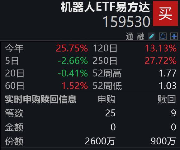 国证机器人产业指数特点鲜明:1.指数人形机器人含量居首:指数中人形机器人相关公司权重显著高于 同类指数;2.指数聚焦高成长龙头:前十大权重股占比约40%,涵盖汇川技术、科大讯飞、石头科技等 细分领域龙头,技术壁垒高、市场竞争力强。 | | 机器人ETF易方达 | ポ | | --- | --- | --- | | | 159530 | | | | | 通融 / Q + | | マキ | 25.75% 120日 | 13.13% | | 5日 | -2.66% 250日 | 27.72% | | 20日 | -0.41% 52周高 | 1.77 | | 60日 | 1.52% 52周低 | 1.03 | | 实时申购赎回信息 | 申购 | 陵回 | | 笔数 | 25 | 9 | | 金额 | 0 | 0 | | 份额 | 2600万 | 900万 | 消息面上,宇树科技在官网上线了一套人形机器人数采训练全栈解决方案。该方案基于一款轮式机器人 G1-D,由人形机器人本体、系统化的数据采集工具和全面的模型训练及推理工具组成。 招商证券表示,人形机器人方面,特斯拉11月7日在股东大会公布Optimus擎天柱机器人最 ...