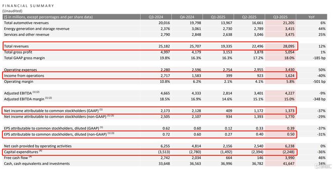 以下文章来源于一见Auto ,作者郑植文 一见Auto . | (Unaudited) | | | | | | | | --- | --- | --- | --- | --- | --- | --- | | ($ in millions, except percentages and per share data | Q3-2024 | Q4-2024 | Q1-2025 | Q2-2025 | Q3-2025 | YOY | | Total automotive revenues | 20,016 | 19,798 | 13,967 | 16,661 | 21,205 | 6% | | Energy generation and storage revenue | 2,376 | 3,061 | 2,730 | 2,789 | 3,415 | 44% | | Services and other revenue | 2,790 | 2,848 | 2,638 | 3,046 | 3,475 | 25% | | Total revenues | 25,182 | 25,707 | 19,335 | 22,49 ...