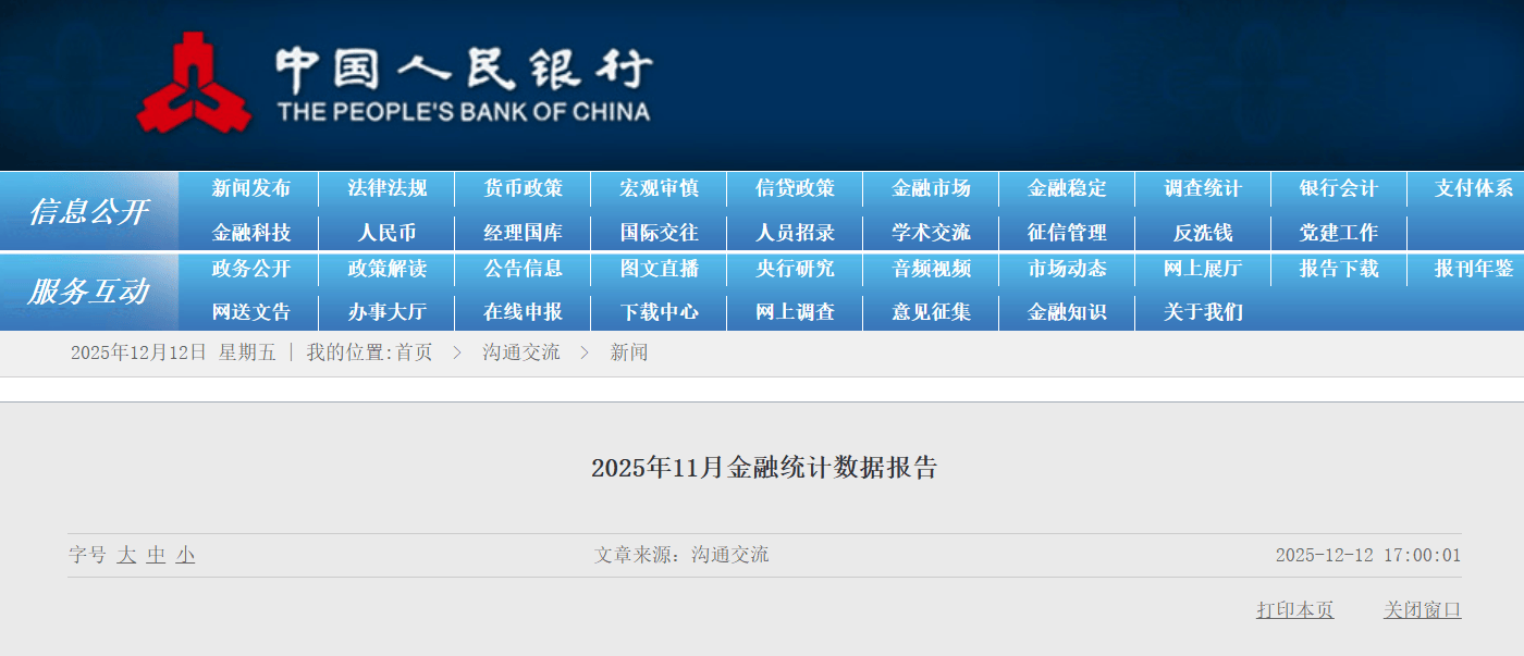 11月金融统计数据出炉!M2同比增长8% 前11个月人民币贷款增加15.36万亿元