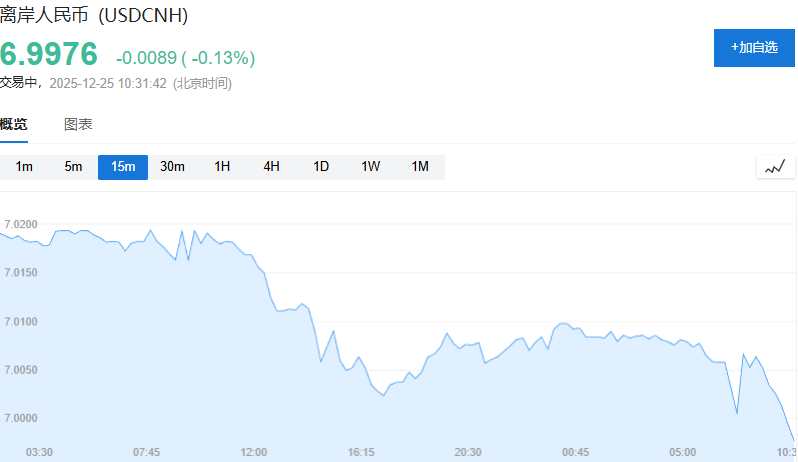 中金公司研报表示,人民币汇率在11月下旬以来连续升值,近期持续刷新年内新高,离岸人民币汇率升 值突破7.0,升值速率有所加速。12月25日,离岸人民币汇率升破7.0,创下2024年9月后新高,在岸人民 币汇率距离7.0关口亦只有一步之遥,并创下2023年5月后新高。我们认为,美元贬值和季节性因素或是 人民币当前升值的直接推动力,不过货币当局适度抑制了汇率升值的速率。整体来看,我们认为人民币 汇率年末的升值行情并不意外,不过幅度略超预期,首要因素或是美元跌幅较大,叠加季节性因素共 振,推动了人民币汇率短期内的较快升值。 (文章来源:第一财经) ...