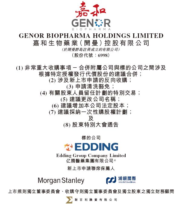 香港聯合交易所有限公司及證券及期貨事務監察委員會對本聆訊後資料集的內容概不負責,對其準確性或 完整性亦不發表任何聲明,並表明概不就因本聆訊後資料集全部或任何部分內容而產生或依賴該等內容而 引致的任何損失承擔任何責任。 a a a a a a a a a a a a a a a a GENOR BIOPHARMA HOLDINGS LIMITED 嘉和生物藥業(開曼)控股有限公司 (「本公司」) (於開曼群島註冊成立的有限公司) (股份代號:6998) 的聆訊後資料集 警告 閣下如已將名下之嘉和生物藥業(開曼)控股有限公司股份全部售出或轉讓,應立即將本通函連同隨附之代表委任表格,送交買主或承讓 人或經手買賣或轉讓之銀行、股票經紀或其他代理,以便轉交買主或承讓人。 本通函僅供參考,並不構成收購、購買或認購本公司證券的邀請或要約。 a a a a a a a a a a a a a a a a GENOR BIOPHARMA HOLDINGS LIMITED 嘉和生物藥業(開曼)控股有限公司 本聆訊後資料集乃根據香港聯合交易所有限公司(「聯交所」)及證券及期貨事務監察委員會(「證監會」)的 要求而刊發,僅用作向香港 ...