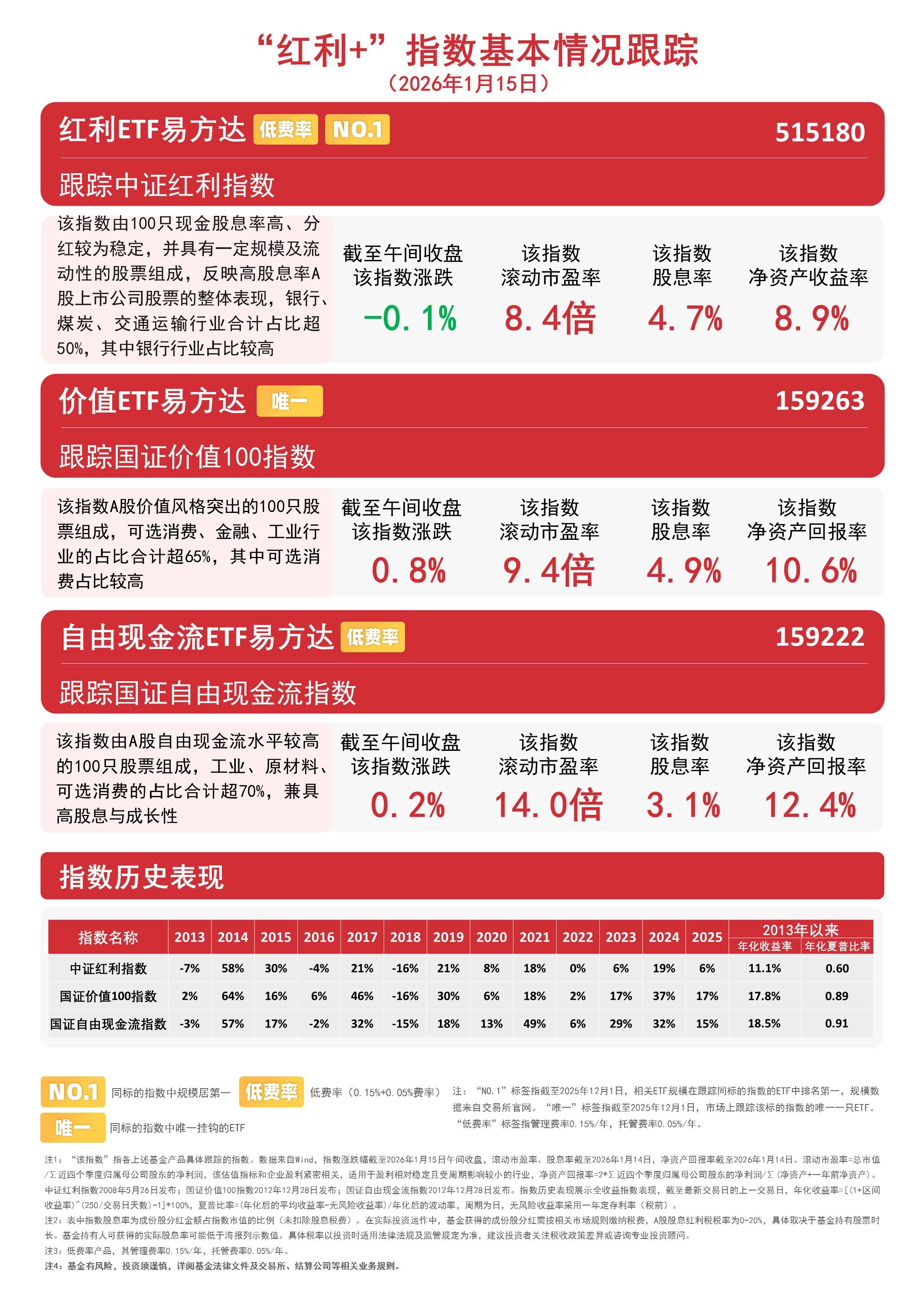市场表现与资金流向 - 今日早盘“红利+”指数震荡分化,国证价值100指数上涨0.8%,国证自由现金流指数上涨0.2%,中证红利指数下跌0.1% [1] - 相关ETF受资金关注,价值ETF易方达(159263)和自由现金流ETF易方达(159222)近一周分别获6500万元和1.8亿元资金净流入 [1] 指数编制方法与特点 - 国证价值100指数采用“高分红+高自由现金流+低市盈率”三维筛选体系,优选价值标的,历史表现稳健 [1] - 国证自由现金流指数采用自由现金流率进行选样,由A股自由现金流水平较高的100只股票组成,工业、原材料、可选消费的占比合计超70%,兼具高股息与成长性 [1][4] 指数历史业绩对比 - 根据截至2026年1月15日的历史数据,各指数年度涨跌幅如下 [4]: - 中证红利指数:2013年(-7%),2014年(58%),2015年(30%),2016年(-4%),2017年(21%),2018年(-16%),2019年(21%) - 国证价值100指数:2013年(2%),2014年(64%),2015年(16%),2016年(6%),2017年(46%),2018年(-16%),2019年(30%) - 国证自由现金流指数:2013年(-3%),2014年(57%),2015年(17%),2016年(-2%),2017年(32%),2018年(-15%),2019年(18%) 相关ETF产品信息 - 价值ETF易方达(159263)和自由现金流ETF易方达(159222)分别跟踪国证价值100指数和国证自由现金流指数 [1] - 自由现金流ETF易方达(159222)在同标的指数ETF中规模居第一,费率为0.15%管理费加0.05%托管费,是同标的指数中唯一挂钩的ETF [4]