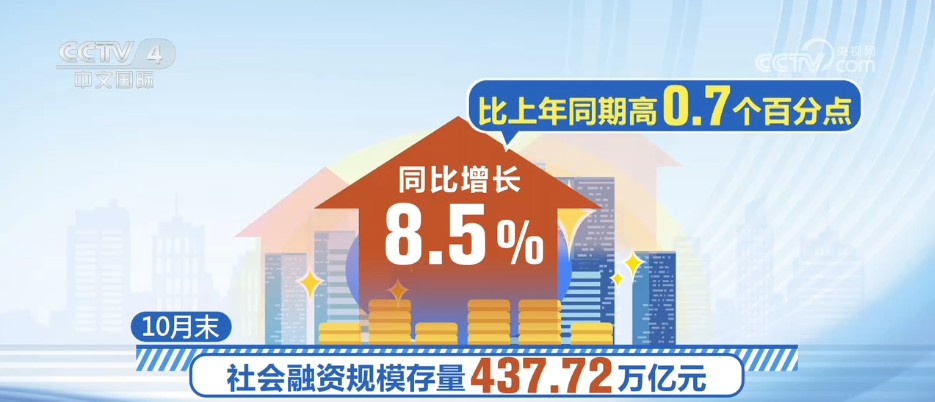 货币政策与金融总量 - 10月末广义货币M2余额335.13万亿元,同比增长8.2% [4] - 10月末社会融资规模存量为437.72万亿元,同比增长8.5% [3] - 前10个月社会融资规模增量累计为30.9万亿元,比上年同期多3.83万亿元 [3] - 社会融资规模和M2增速高于同期名义GDP增速约4个百分点 [8] 融资渠道与结构 - 前10个月政府债券累计发行规模约22万亿元,比去年同期多近4万亿元 [3] - 企业发债融资热度较高,对社会融资规模增长形成重要支撑 [3] - 前10个月人民币贷款增加14.97万亿元,企(事)业单位贷款增加13.79万亿元 [6] - 企业融资渠道日益多元化,从依赖银行贷款转变为综合运用债券、股票等市场化融资方式 [4] 贷款利率与融资成本 - 10月份企业新发放贷款加权平均利率为3.1%,比上年同期低约40个基点 [6] - 10月份个人住房新发放贷款加权平均利率为3.1%,比上年同期低约8个基点 [6] - 通过《企业贷款综合融资成本清单》等措施,小微企业贷款综合融资成本得以降低 [7] 政策效果与展望 - 适度宽松的货币政策持续显效,为实体经济提供了有力的金融支撑 [2][4] - 加大政府债券发行规模能够支持重大项目建设和国家重大战略实施,助力扩大需求 [3] - 宏观政策更加关注惠民生、促消费,如实施消费品以旧换新、发放育儿补贴、对个人消费贷款进行贴息等 [9]