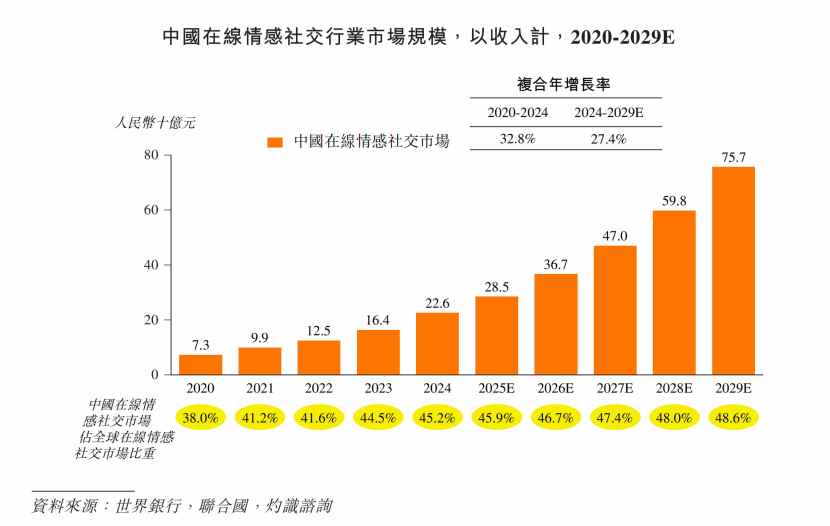 星标 ★ IPO日报 精彩文章第一时间推送 当990万年轻人半夜不睡,挤进手机里的"三方视频相亲房",把红娘当成直播 NPC 刷火箭时,爱情这门古老生意,正在屏幕里被重写代码:不牵红线,牵 流量;不拜月老,拜算法。 张力制图 市场前景广阔 你是否很难想象,勤劳忙碌的中国人却创造了全球最大的在线情感社交市场? 根据咨询机构灼识咨询的资料,2024年中国在线社交行业的收入规模达632亿元, 2020年至2024年的复合年增长率为26.6%,是全球最大的在线社交市 场。 作为增长最快的细分市场,中国在线情感社交市场占中国在线社交市场的份额由2020年的29.5% 提升至2024年的35.7%。中国在线情感社交市场规模自 2020年起以32.8%的复合年增长率扩张,2024年市场规模达226亿元,是全球最大的在线情感社交市场。截至 2025年6月30日,中国在线情感社交平台用户 数约达2.8亿名。 这个数字意味着,如果以中国16至45岁移动互联网用户约5.8亿人来计算,2.8亿情感社交用户在这个池子里占比接近48%,每两个适龄网民里,几乎就有 一个在"网上谈恋爱"? 9月29日,做爱情生意的在线情感社交平台米连科技有 ...