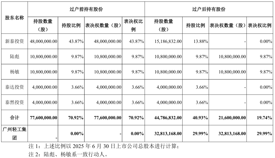 文/梧桐小新 近期,江苏泰慕士针纺科技股份有限公司(泰慕士,001234)披露了关于控股股东协议转让股份完成过户登记暨公司控制权发生变更 的公告。 2025年8月12日,泰慕士控股股东如皋新泰投资有限公司(以下简称"新泰投资")与广州轻工工贸集团有限公司(以下简称"广州轻工 集团")签署了《股份转让协议》,新泰投资拟向广州轻工集团转让其持有上市公司无限售条件流通股32,813,168股,占上市公司总股 本的29.99%。经协商后确定股份转让价款为74,975万元,折合每股转让价格为22.8491元。同时,控股股东新泰投资、股东泰达投 资、泰然投资放弃其合法持有的上市公司合计23,186,832股股份(约占上市公司总股本的21.19%)对应的表决权。本次权益变动后, 广州轻工集团将成为公司控股股东,广州市国资委将成为公司实际控制人。 本次协议转让股份已于2025年9月22日完成过户登记手续,并取得中国证券登记结算有限责任公司出具的《证券过户登记确认书》。 本次协议转让股份过户登记前后转让双方持有公司股份变动情况如下: | 股东名称 | | 过户前持有股份 | | | | 过户后持有股份 | | | | --- ...